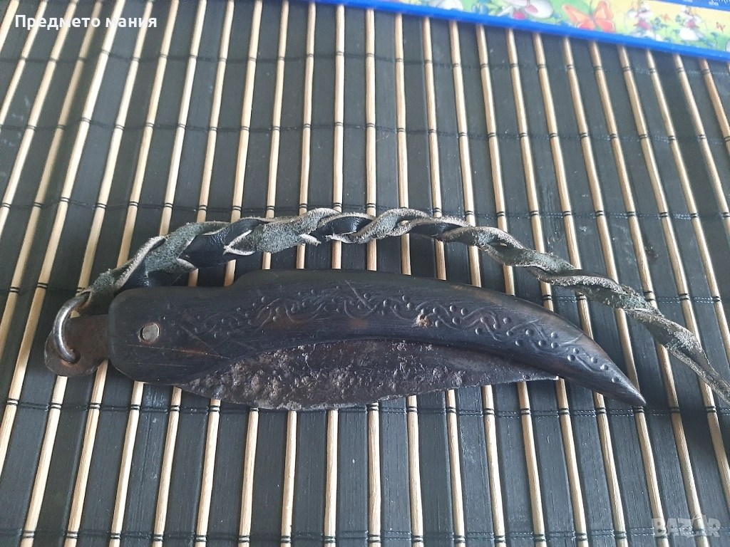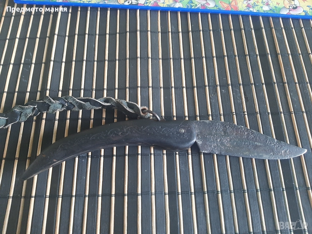 Предлагам старо сгъваемо ножче сойка с характерен извит силует. Острието и дръжката носят автентична патина от времето, което му придава колекционерска визия. Дръжката е с декоративна гравировка, а към ножа има и кожена плетена каишка.