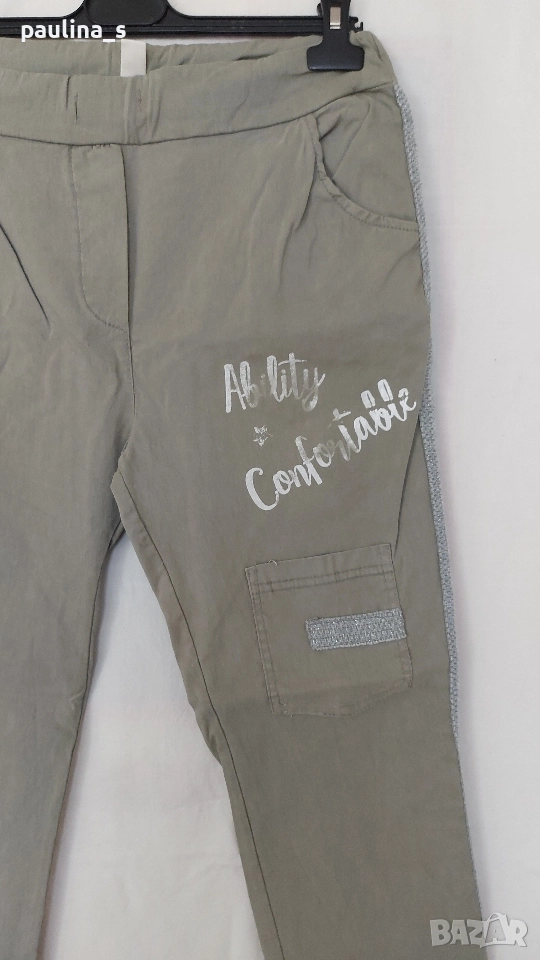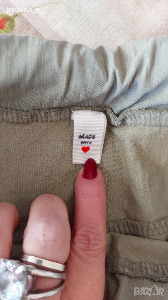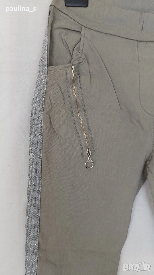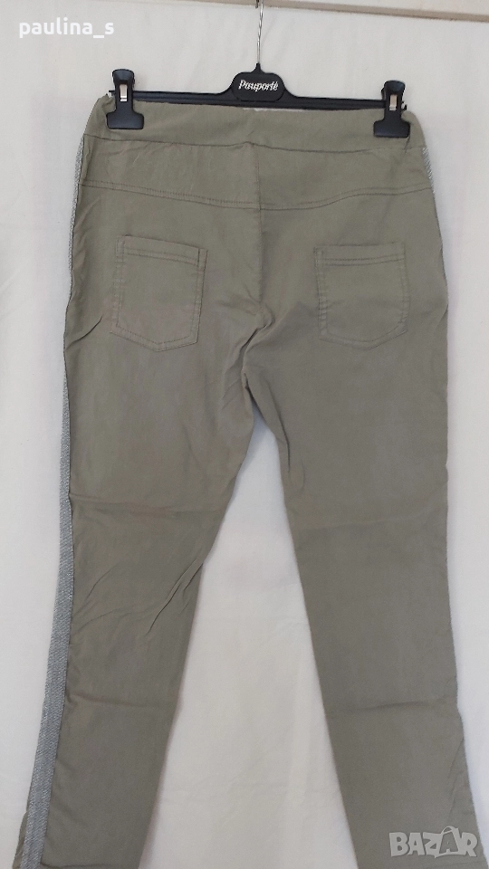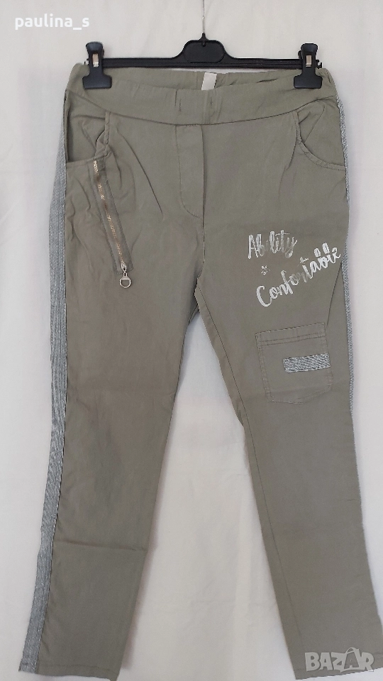 3️⃣. M / 2XL - "Made with ❤️". Цената е крайна, без пазарлъци 20 евро. Дамски марков, много еластичен панталон, слим крачоли, джобове с цип, щампи, кант в страни. Като, нов е, без дефекти и етикет, ун. Цветът е Шам фастък, неутрален е, подходящ е всички комбинации. Перфектна дреха и изработката е гарантирана от бранда.
