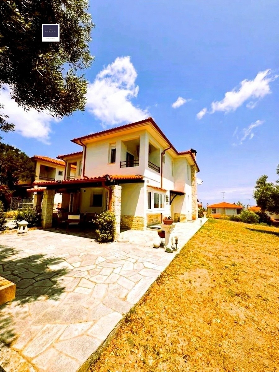 'Marinas Estates' представя на Вашето внимание една просторна и светла къща в отлично състояние(тип мезонет) на три нива, разположена в тих район с прекрасна частна градина, намираща се в Ханиоти, на 1200 м. от морето.