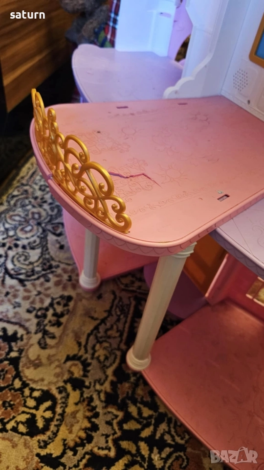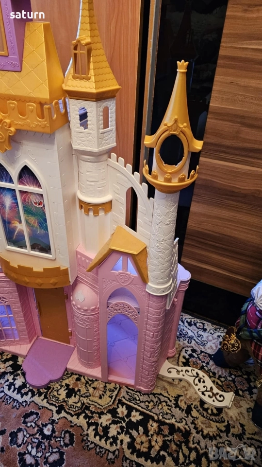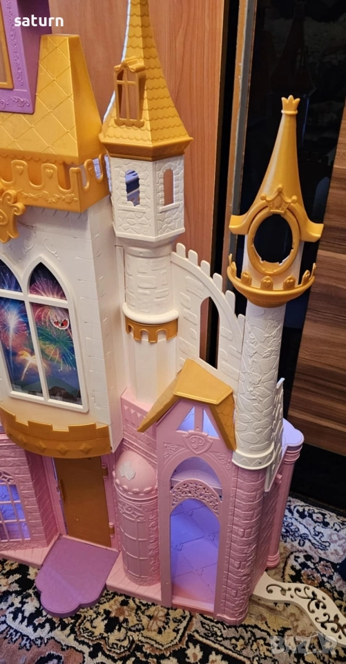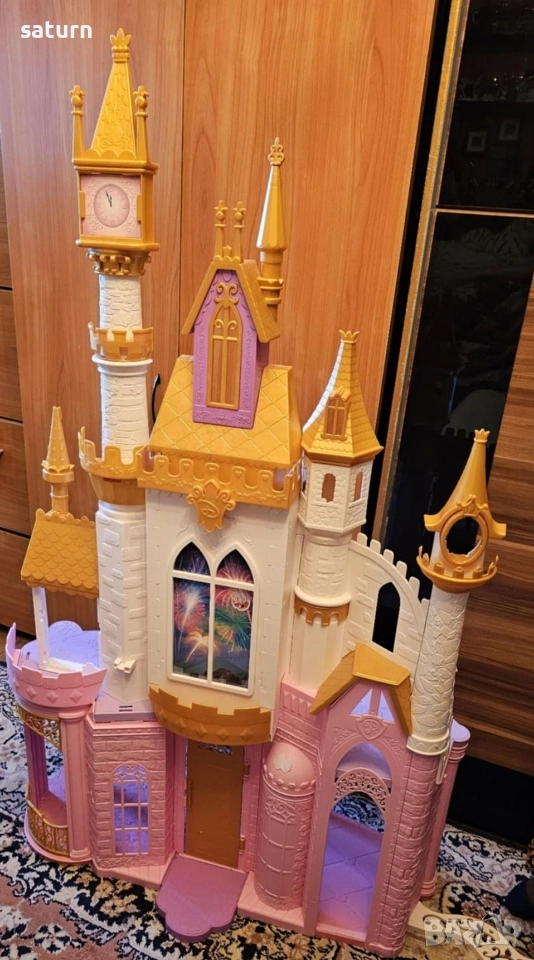 Голям много красив замък за кукли Disney произведен от Hasbro. Височина 130 см. Широчина 80 см. Дълбочина 30 см. Замакът е втора употреба с липси: липсват мебелите и една люлка, врата, часовник на едната кула. Отзад има сцепване на едно място, но може да се залепи. Има красиви фойерверки. Отпред изглежда в много добро състояние. Купуван е за 450 лева Обвата важи само за гр. София център с лично предаване.