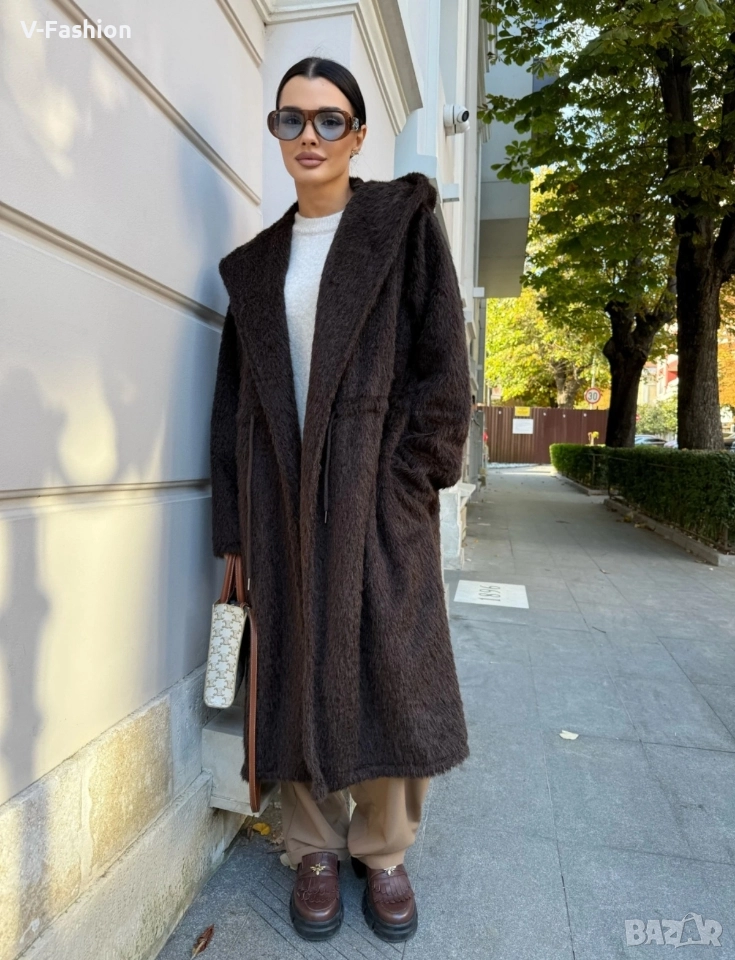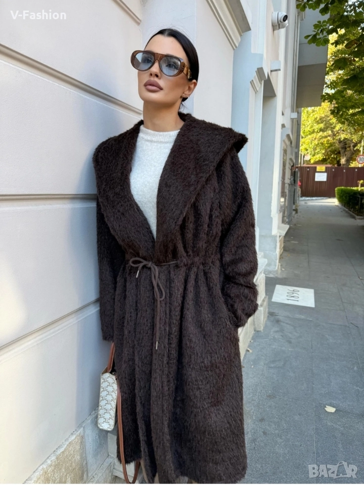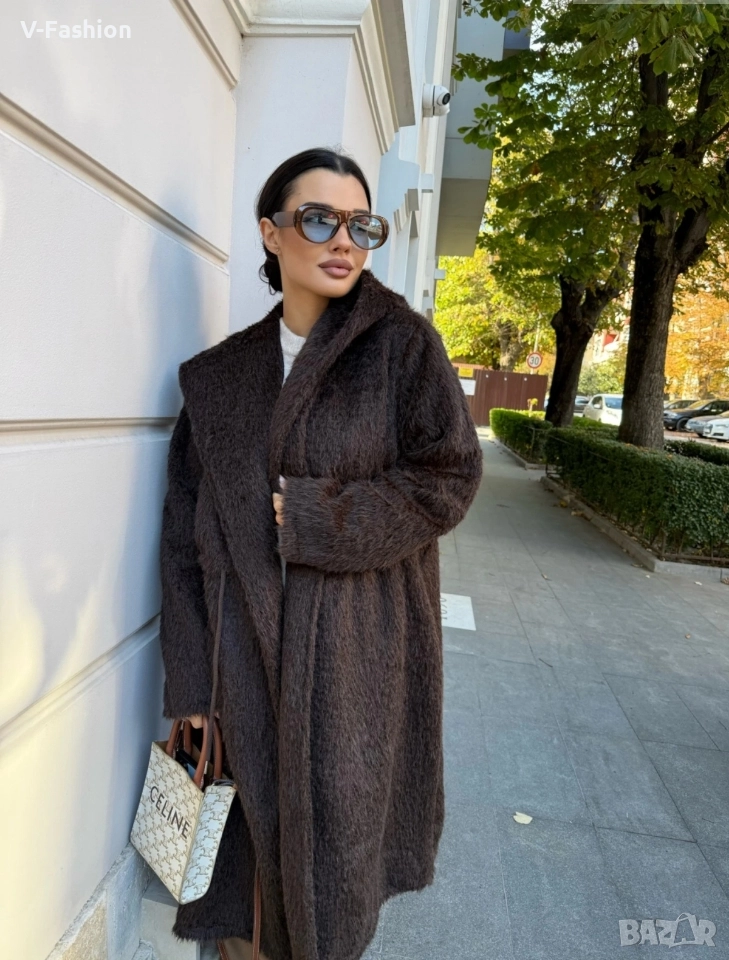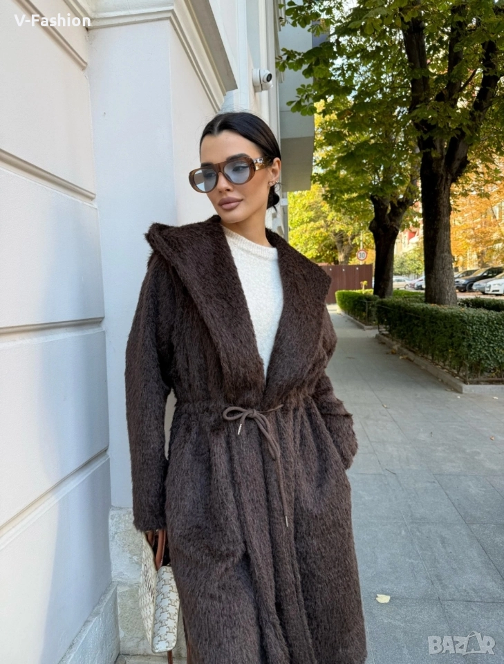 Дълго мъхесто палто с прав свободен силует и връзка в талията, която се регулира. Изработено от висококачествен полиестер. Размер Гръдна обиколка 114см Талия 122 см Дължина 107