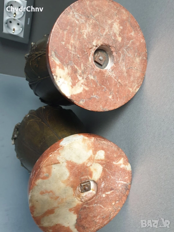 мрамора 10 см (височина 3 см), отвор 7 см, общо тегло около 4 кг (2 кг на ваза), детайлни, двустранни (различни флорални мотиви от всяка страна), здрави, стабилни, естествен мрамор (не е композит), закрепване с квадратни гайки.