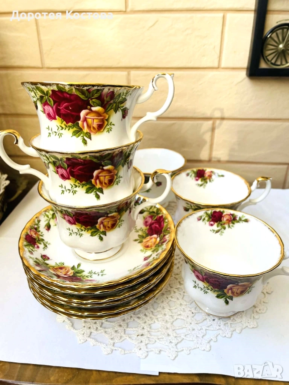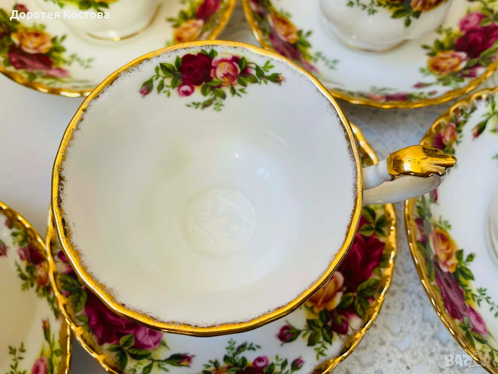 ROYAL ALBERT красив двоен сет за чай или дълго кафе от костен порцелан от Англия, най-известната им серия - Стари селски рози. Всеки сет включва чаша с вместимост 200 мл до ръба и подложна чинийка. Всички части са в отлично състояние и с маркировки. Прекрасни и качествени, винаги актуални. Посочената цена е за 1 двоен сет. Налични са 6 сета. С предимство е заявилият повече.