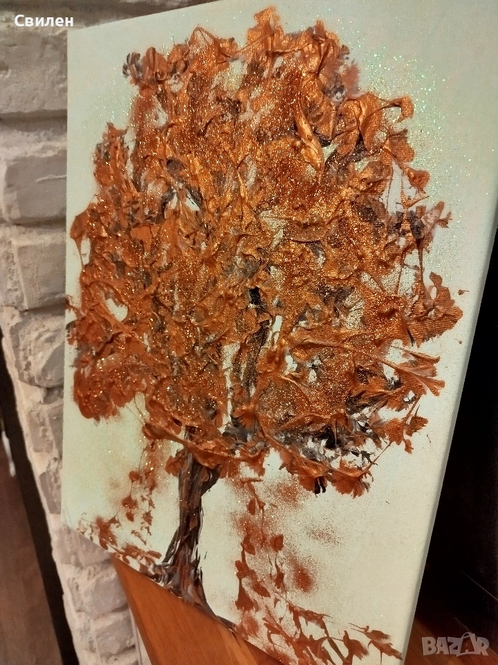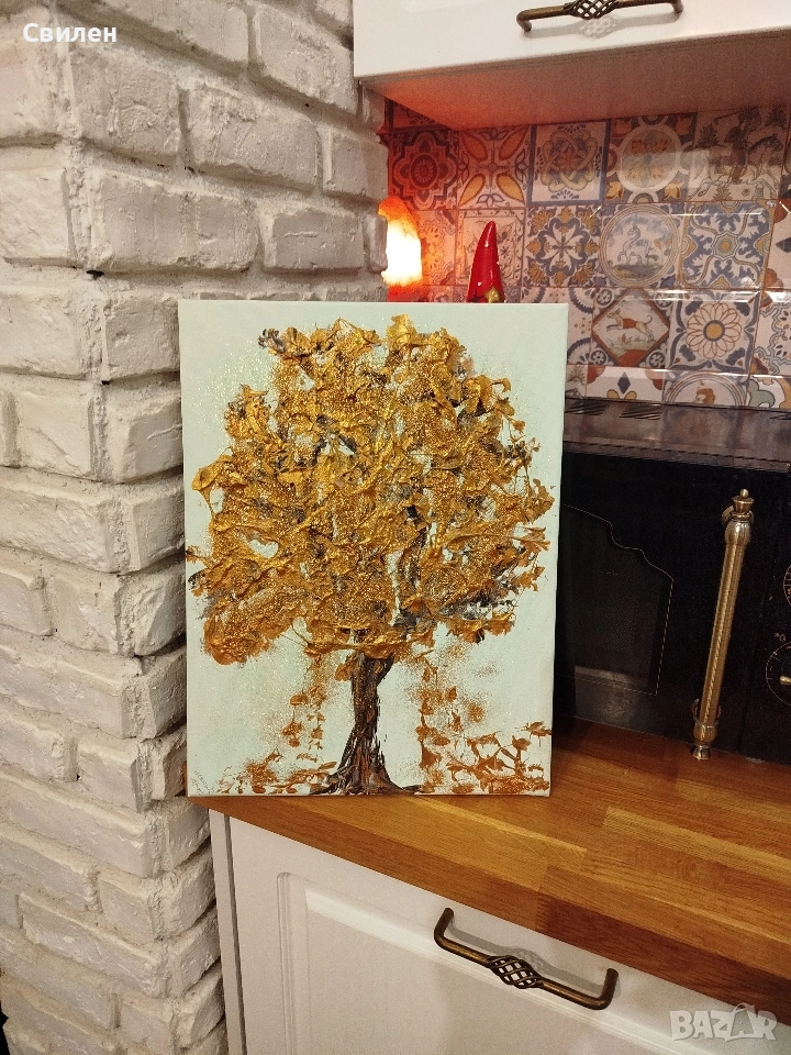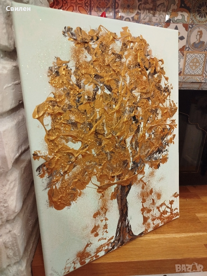 Картина на автор, изобразяваща есенно дърво с оранжеви и златисти листа.
