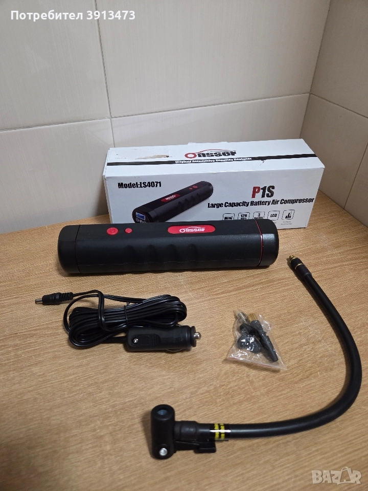 Oasser P1S е преносим акумулаторен въздушен компресор, предназначен за помпане на гуми и други надуваеми предмети.