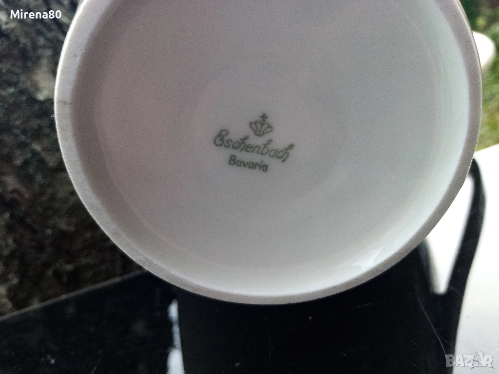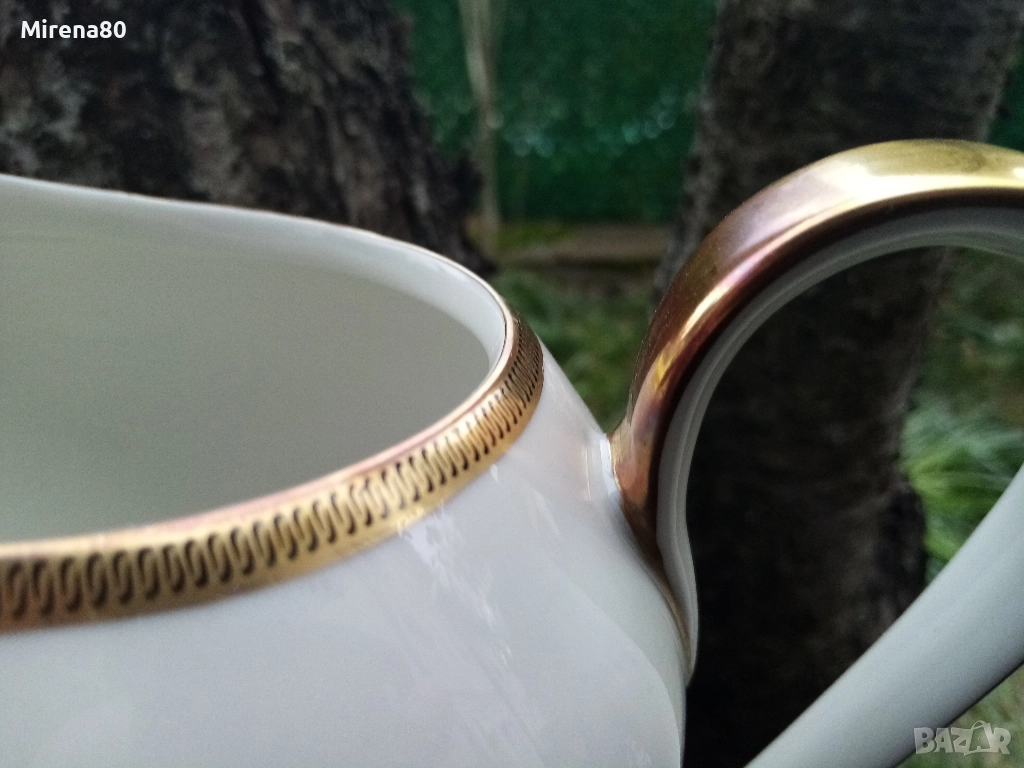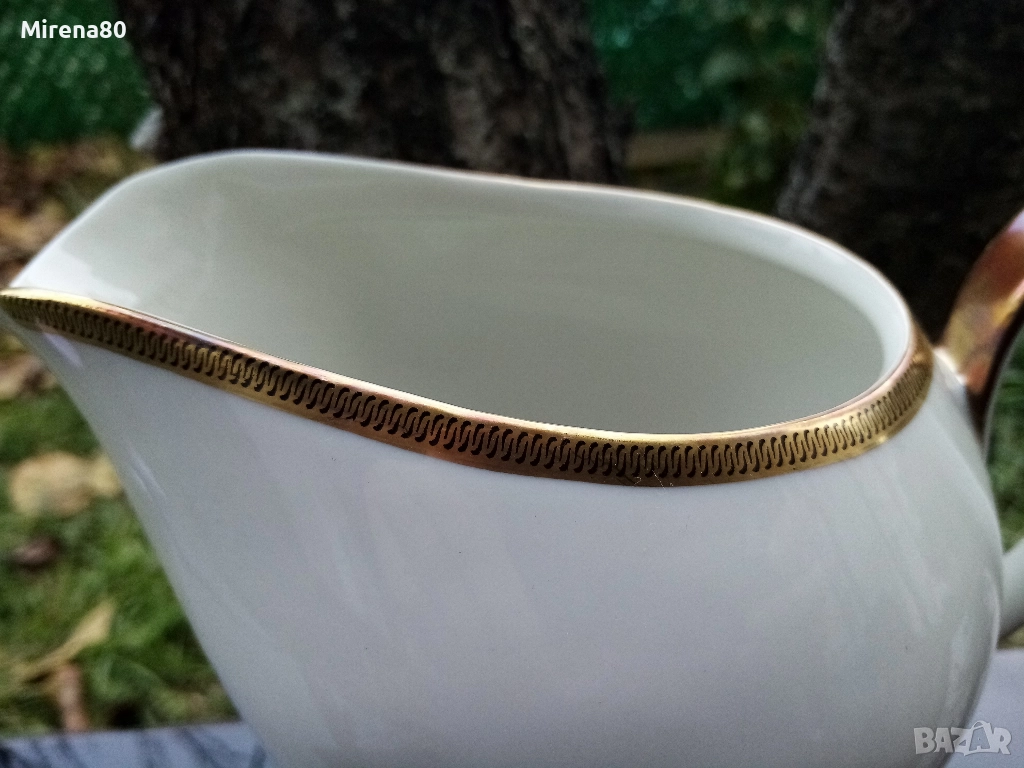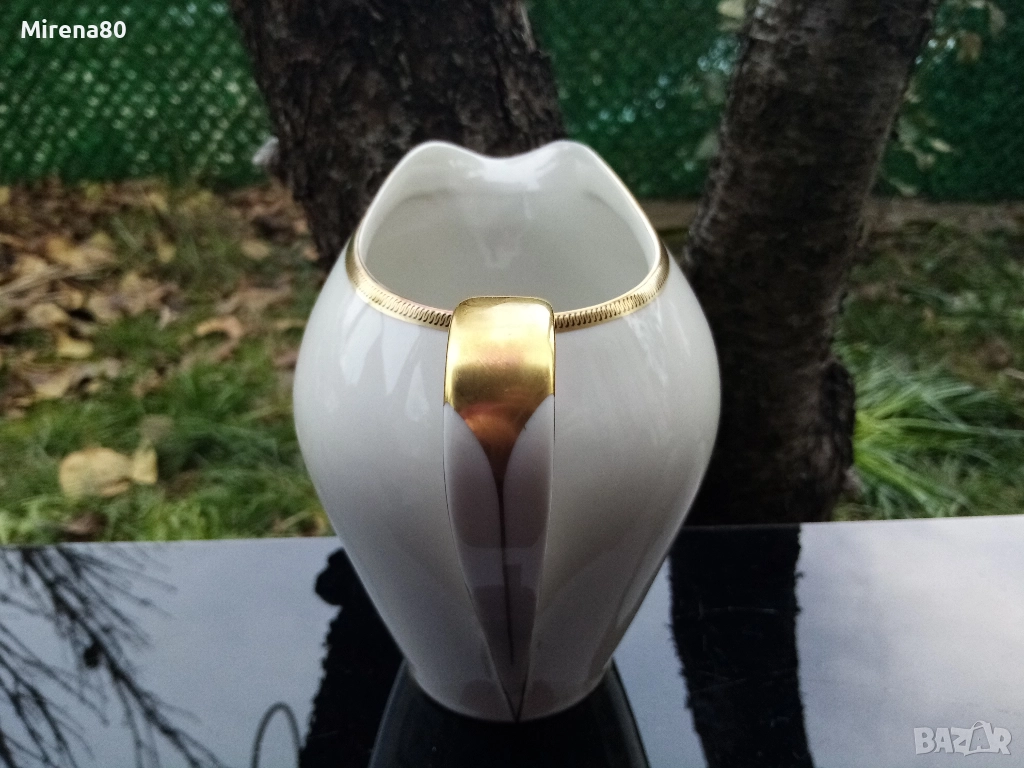 Великолепна кана от втората оловина на миналия век на водещ баварски производител. Интересна асиметрична форма, кремобразен порцелан цвят слонова кост с плътен златен филигран - много красива и елегантна ! Вмест. около литър, вис. 15 см. Отлично състояние !