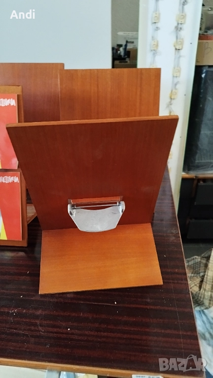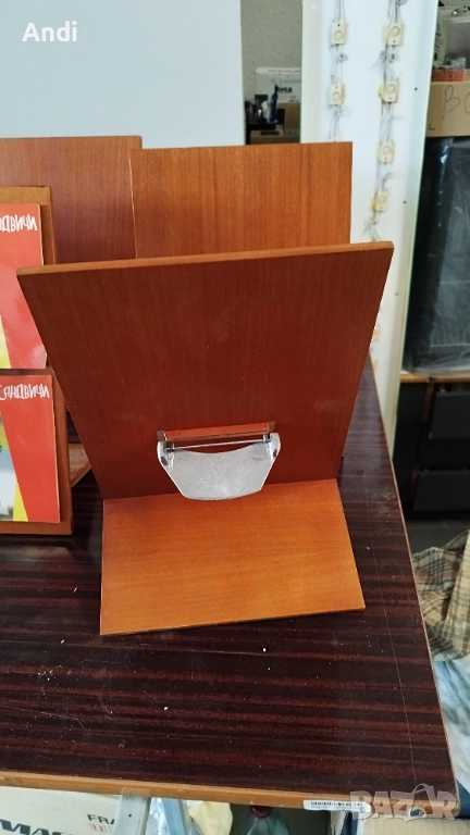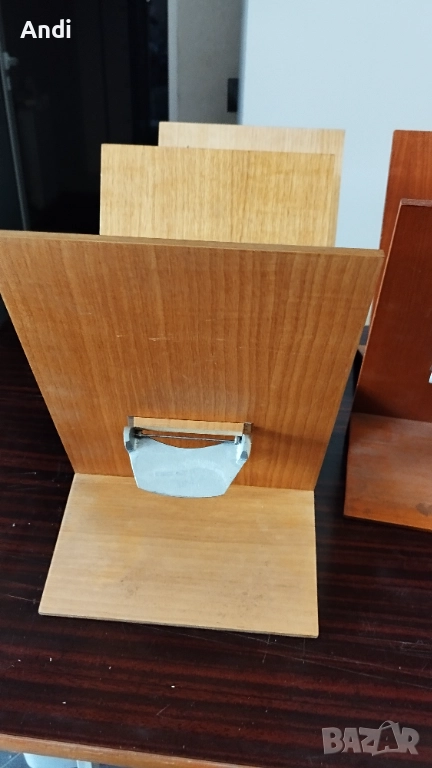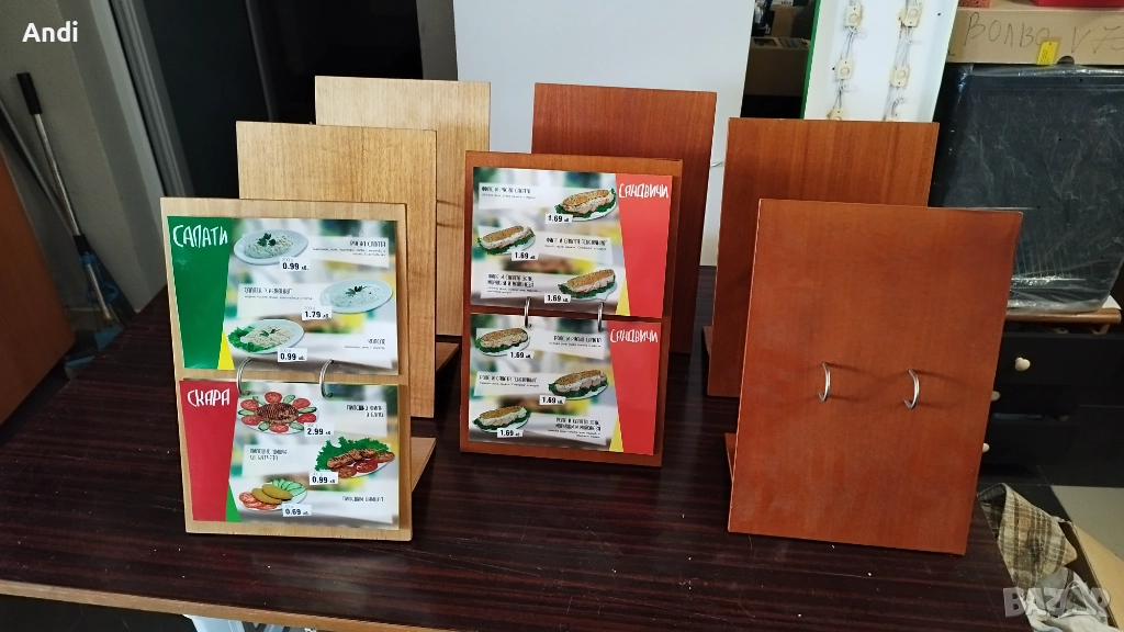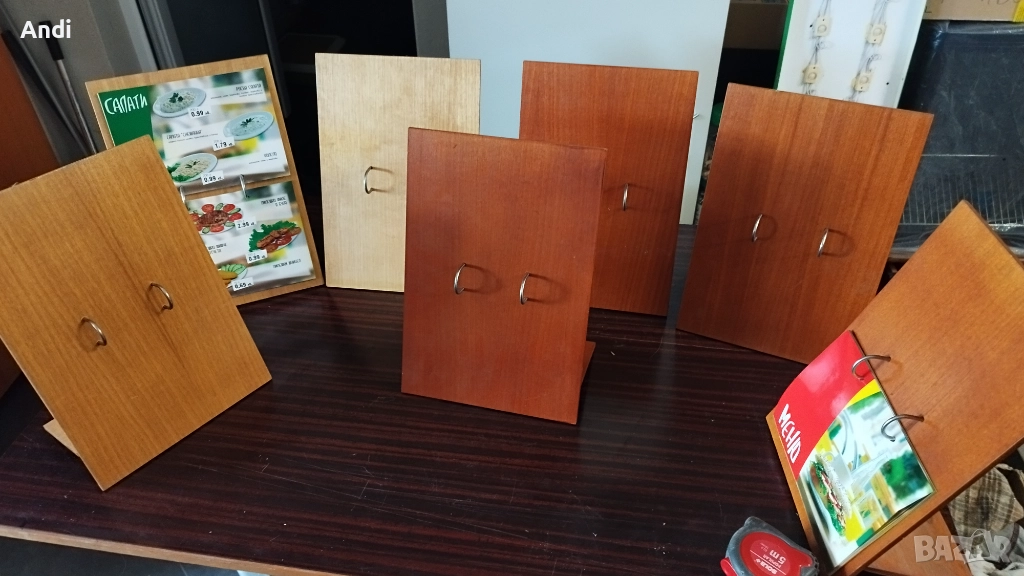 Продавам 10бр дървени стойки за менюта с механизъм за закачане на многолистово меню. Размерите на подлойката са ширина 23см и височина 34см, подпората е дълга около12см. Налични са 10бр. Цената за бройка е 17евро. При покупка на 10бр цената е 150евро. Цвета на една част е светло кафяв дъб, и на другите е червеникаво кафяв махагон.