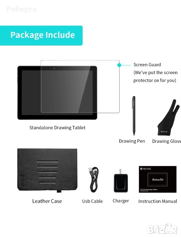 Графичният таблет Frunsi RubensTab T11 Pro е самостоятелно Android устройство с 10.1-инчов FHD IPS дисплей, 8192 нива на чувствителност към натиск и включен стилус, предназначено за дигитално рисуване, което работи "извън кутията" с предварително инсталирани приложения за рисуване и мощен хардуер (Octa-Core CPU, 6GB RAM, 128GB ROM). Той предлага Wi-Fi 5, Bluetooth 5.0, Type-C порт, двойни камери, quad говорители, G-сензор и лек сензорен екран, като идва в комплект с всичко необходимо за работа.