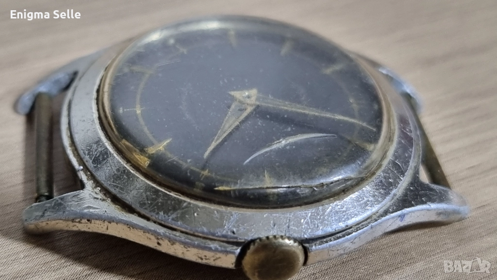 Часовникът е с механичен механизъм и черен циферблат.