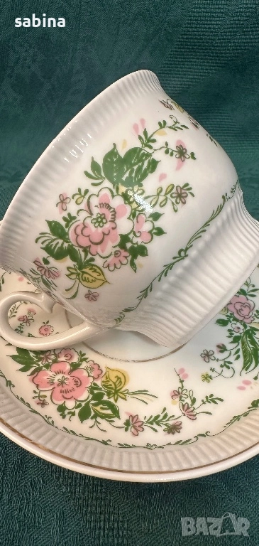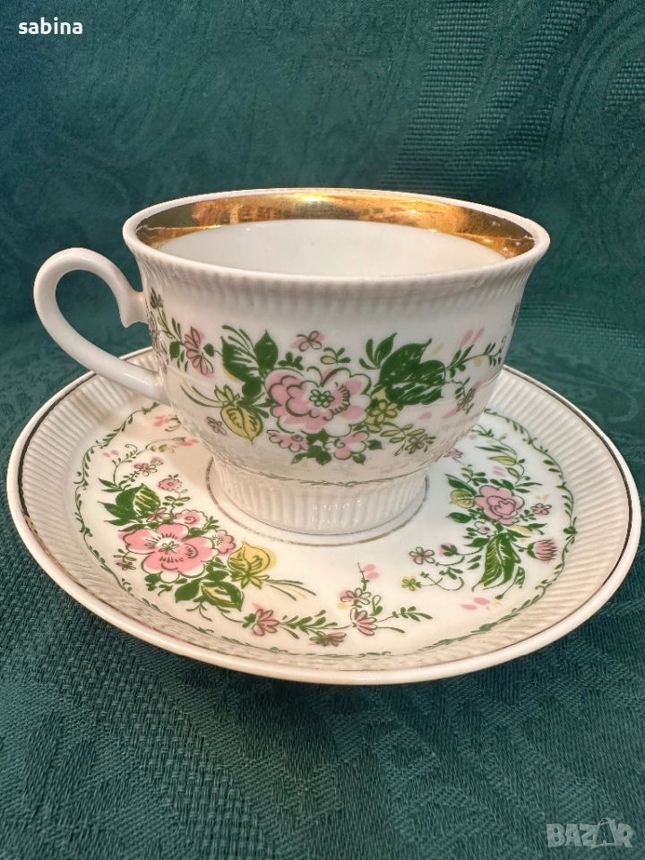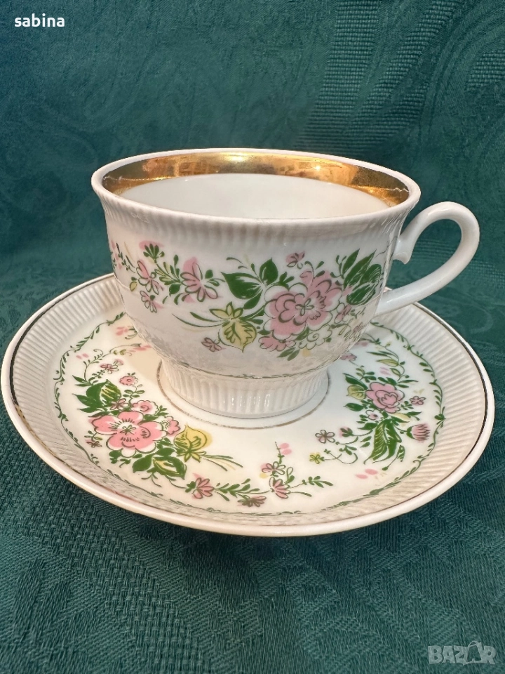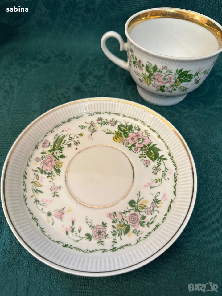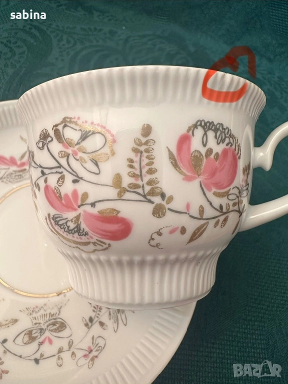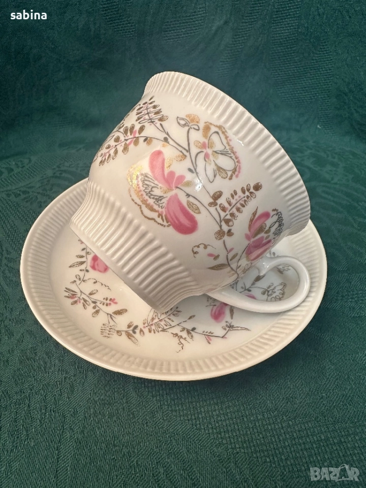 Много рядък ретро двоен сет за чай или кафе „Душистый гошек“ или “Розовый цветок” (Ароматен грах или Розово цвете) на ЛФЗ (Ленинградский фарфоровый завод „Ломоносов“), СССР – 1970 г. -1979 г. Рядка форма, но много удобна и практична– „Релефна“ (автор на формата – Б.Биструшкин). Обем на чашата 220 мл. Прекрасен твърд порцелан, много нежни и леки, ръчно рисувани елементи, релефни. В отлично състояние. Останал е 1 брой с миниатюрно отлюспване в релефа на чашката, забелязва се само при напипване. Цена за сет с люспичка-30 евро. подарък 1 сет с дефект