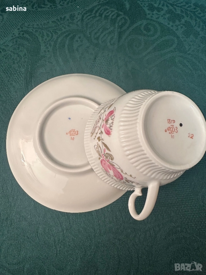 Ретро двоен сет за чай или кафе с флорален декор на ЛФЗ (Ленинградский фарфоровый завод „Ломоносов“), СССР – 1970 г. -1979 г. Рядка форма, но много удобна и практична– „Релефна“ (автор на формата – Б.Биструшкин). Обем на чашата 220 мл. Прекрасен твърд порцелан, много нежни и леки, ръчно рисувани елементи, релефни. Нямат счупено и пукнато, на места потъмняване на златен кант на чашките, предвид достолепната им възраст. Цена 30 евро за сет. При покупка на всички-подарък сет с дефект