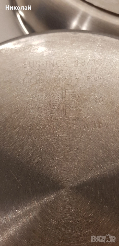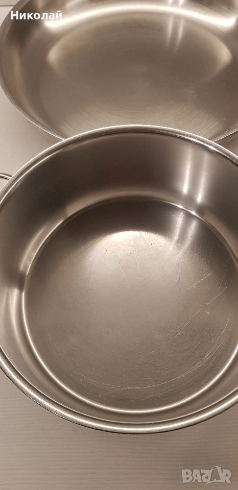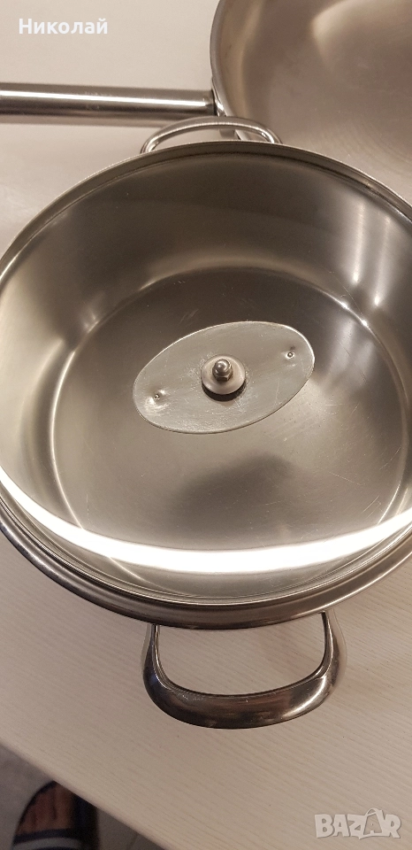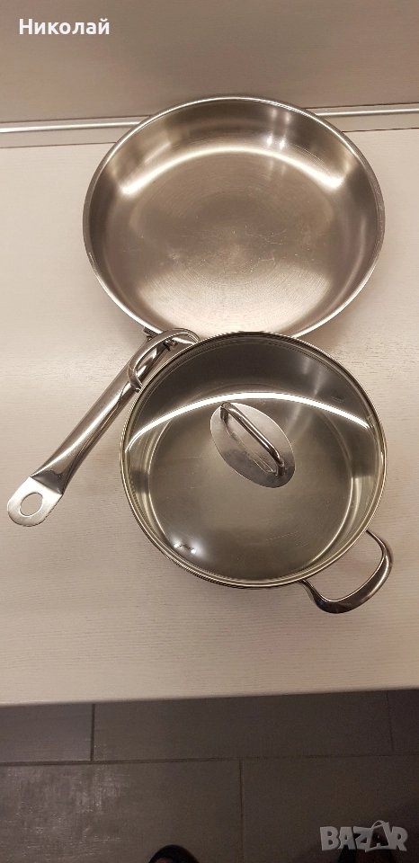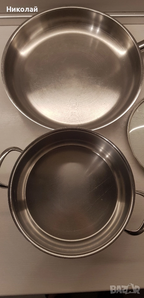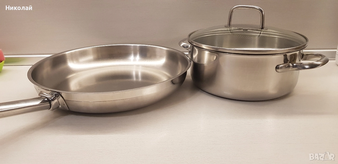 Висококачествени съдове за готвене произведени в Германия.Ползвани,но в отлично състояние,без забележки. Материал-неръждаема хром-никелова стомана 18/10.Тигана е с размер 28см диаметър на капака,а тенджерата е 20см със стъклен капак и обем 2,5л.Тежат около 3кг общо.