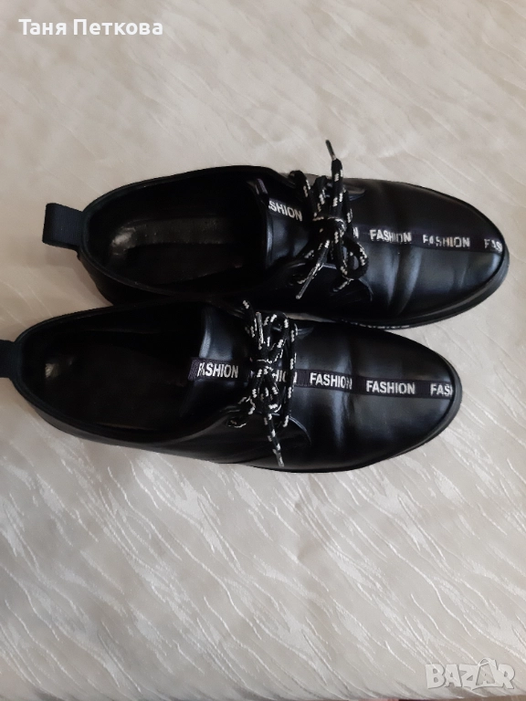 Ежедневни дамски обувки от естествена кожа.Черен цвят,с бели акценти(надписи),номер 39.Езключително удобни,много запазени,равна платформа
