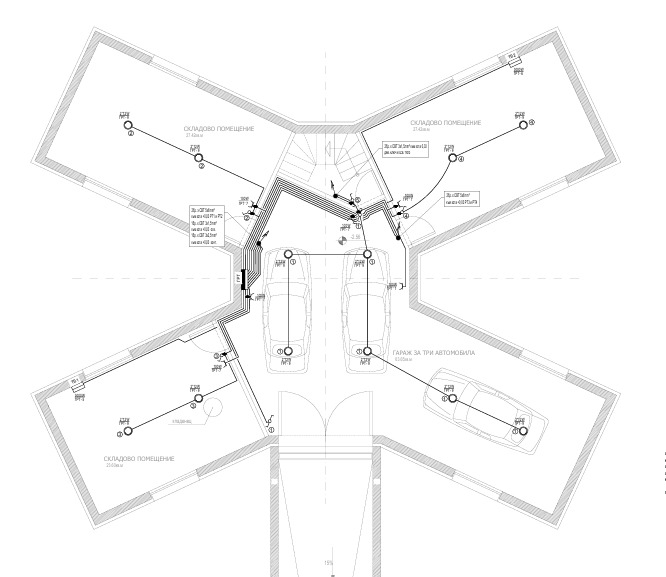 - Застроена площ 198кв.м и разгърната застроена площ 398кв.м - етаж - 1 ( 3 бр. складови помещения, 3бр. гаражи )