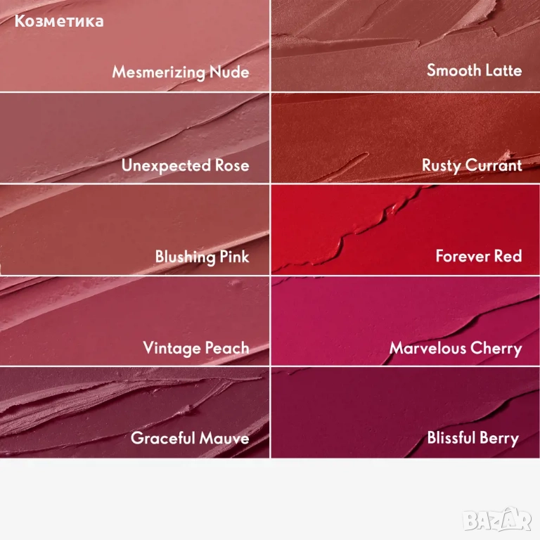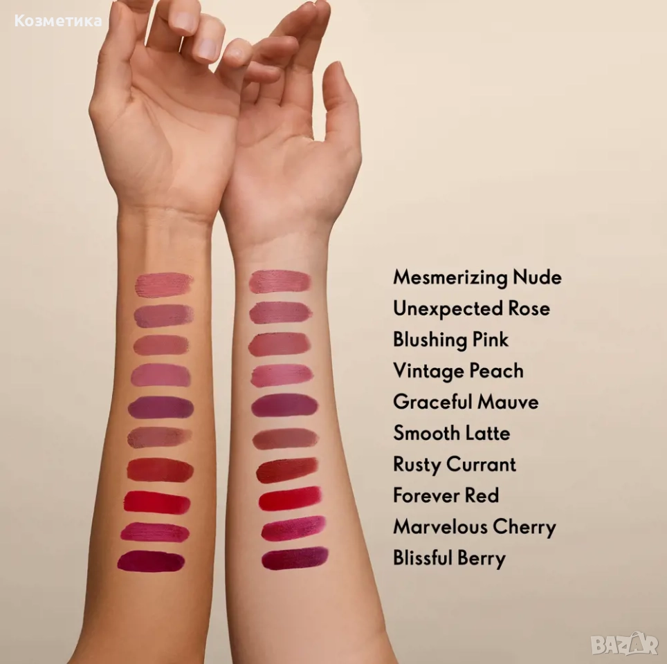 Богата на пигменти формула обгръща устните с 8-часов дълготраен цвят
