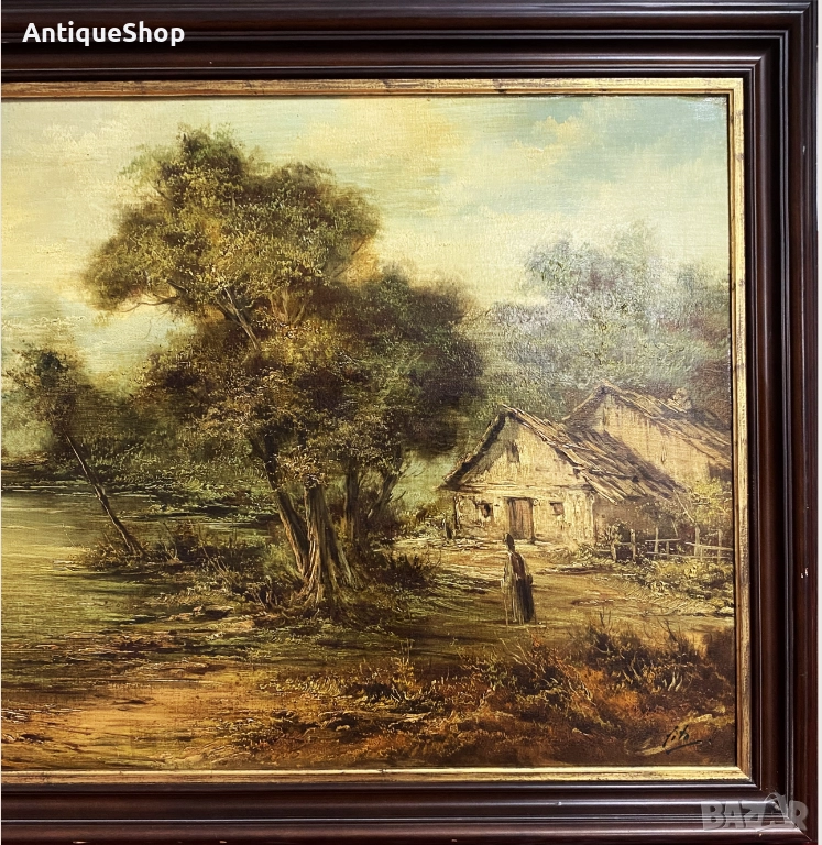 Стара картина. Пейзаж. Къща с езеро. Масло върху платно. Подписана.