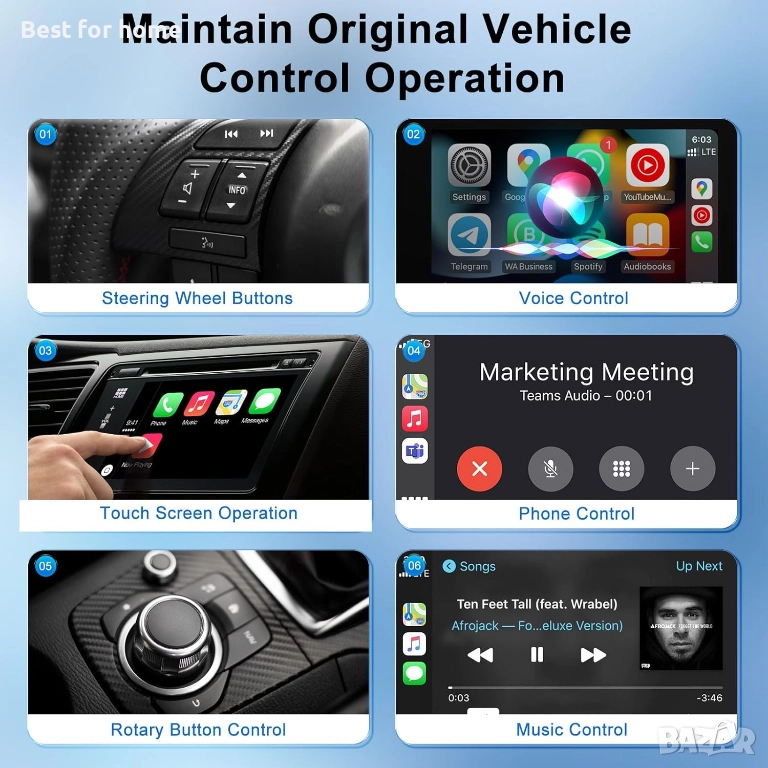 Безопасно и интелигентно шофиране: Безжичният адаптер Carplay за iPhone може да синхронизира приложенията на вашия iPhone. Този безжичен Carplay iPhone поддържа гласово управление, разговори, GPS навигация, iTunes, музикални приложения и съобщения и др. Безжичният Carplay адаптер също така запазва гласовия асистент на оригиналните контроли на автомобила, като волан, бутони и сензорен екран.