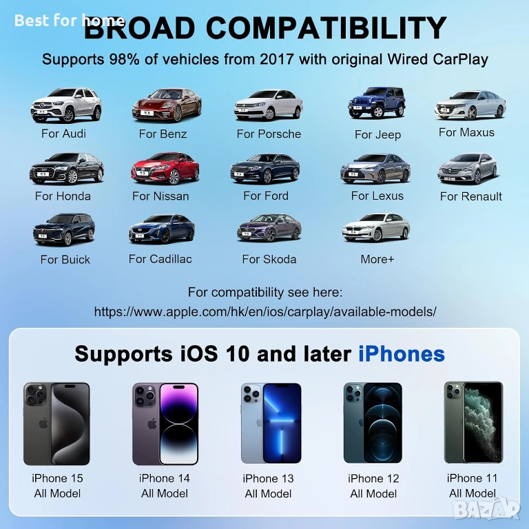 Универсална съвместимост: Безжичният Carplay адаптер работи само с iPhone iOS 10 и по-нови версии. Bluetooth адаптерът Carplay е подходящ за модели автомобили от 2017 г. насам! ! ! Забележка: 1.Не се поддържа за използване с Android. 2. Вашият автомобил трябва да е оборудван с оригиналния кабелен Carplay!