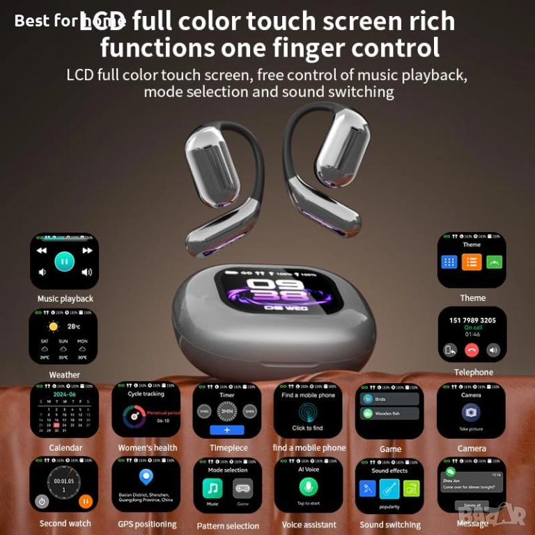 Q16PRO AI безжични слушалки за превод със 70 часа Bluetooth 5.4 спортни слушалки, безжичен интелигентен сензорен екран, чашка за уши с кукички за уши, водоустойчивост IPX5 за бизнес и пътуване