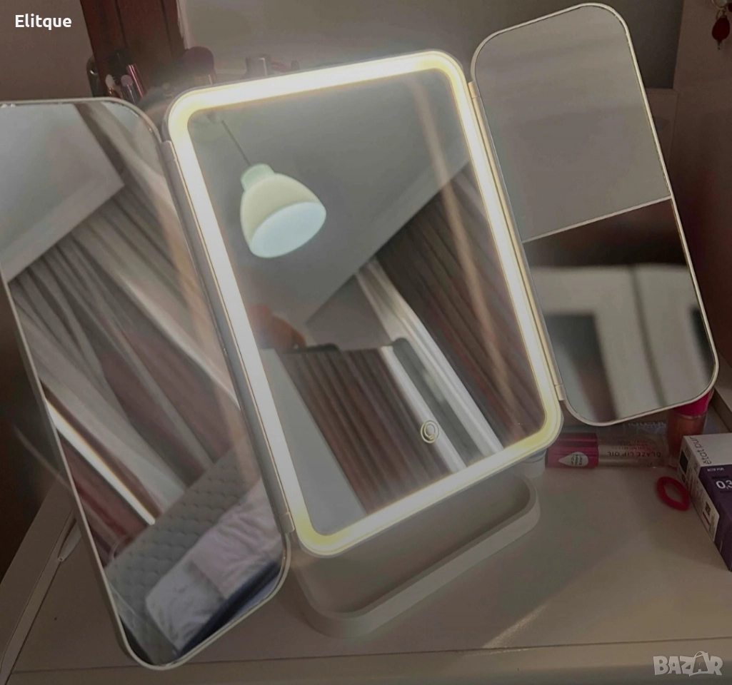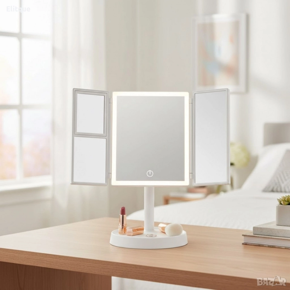 💡 Преносимо LED огледало за тоалетка – перфектно за грим Цена: 13 € Стилно и функционално огледало с висока разделителна способност, което улеснява нанасянето на грим и ежедневната грижа за лицето. ✨ Основни характеристики: Троен сгъваем дизайн: Панорамно виждане от три ъгъла. Страничните огледала са идеални за очна линия, контуриране и детайлна работа. LED осветление със сензорен бутон: Централното огледало е обградено от ярка, но щадяща очите LED лента. Регулира се лесно с едно докосване. Стабилна стойка с органайзер: Кръглата основа държи огледалото стабилно и служи за червила, бижута или други аксесоари. 🎨 Цвят: Бял 🧵 Материал на рамката: ABS 🚚 Доставка: С Еконт – с опция преглед и тест