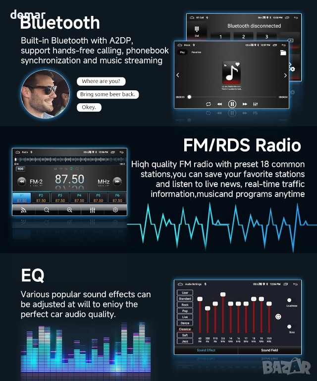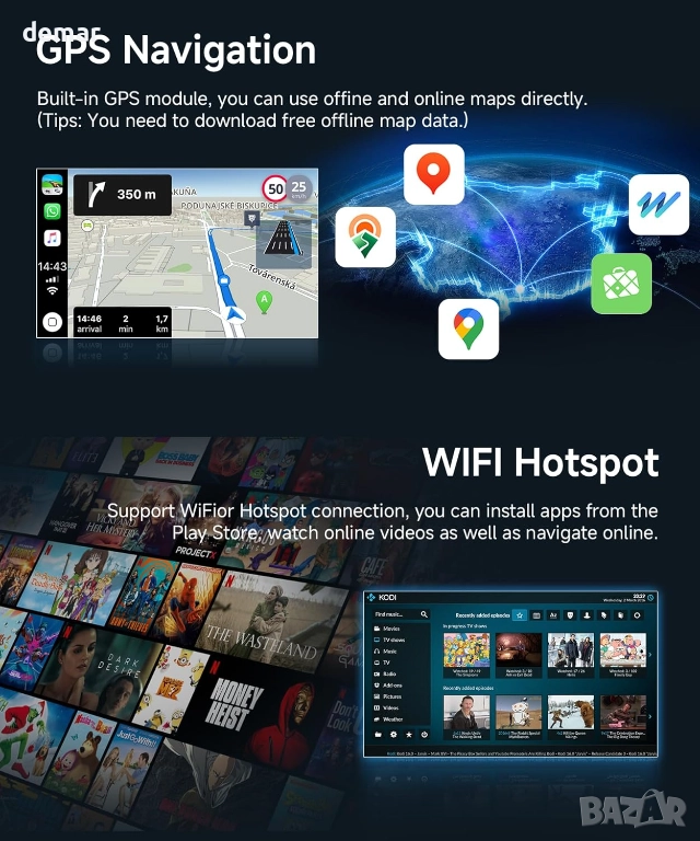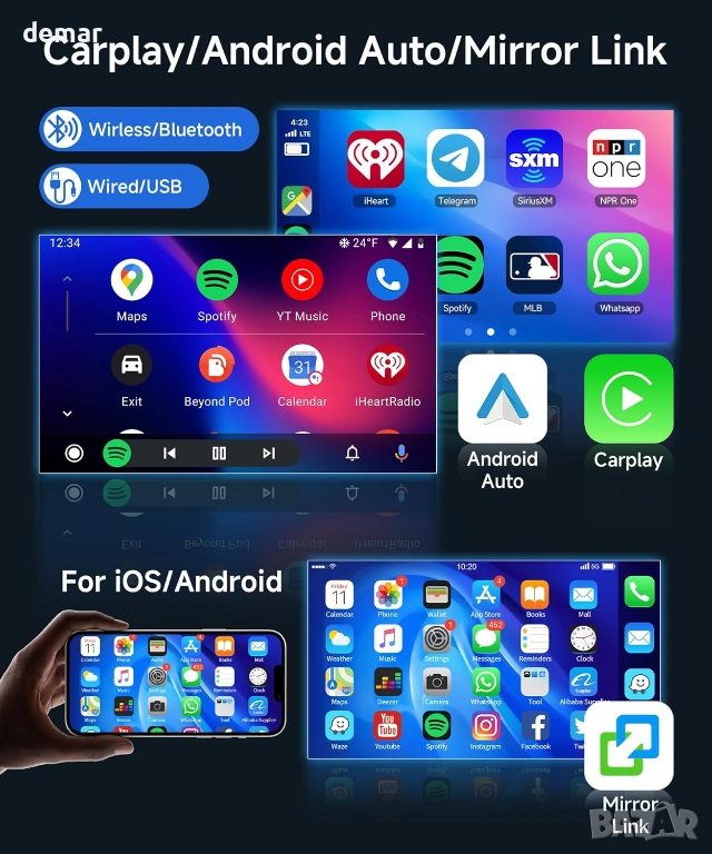 Автомобилна стерео система с Android, проектирана за Ford Transit 2015–2019, с 9-инчов HD сензорен екран с гладка Android система, поддръжка на разделен екран, GPS и WiFi свързаност, както и USB входове. Поддържа безжичен CarPlay, Android Auto и Mirror Link за безпроблемен достъп до навигация, разговори, съобщения, музика, приложения и гласово управление от вашия смартфон. Вграденият GPS позволява както онлайн, така и офлайн навигация чрез приложения за изтегляне. Системата интегрира Bluetooth hands-free разговори и стрийминг на музика, FM/RDS радио с предварително зададени станции и множество EQ звукови режими. Също така поддържа управление от волана и автоматично показва изображение от задната камера при движение на заден ход за допълнително удобство и безопасност.