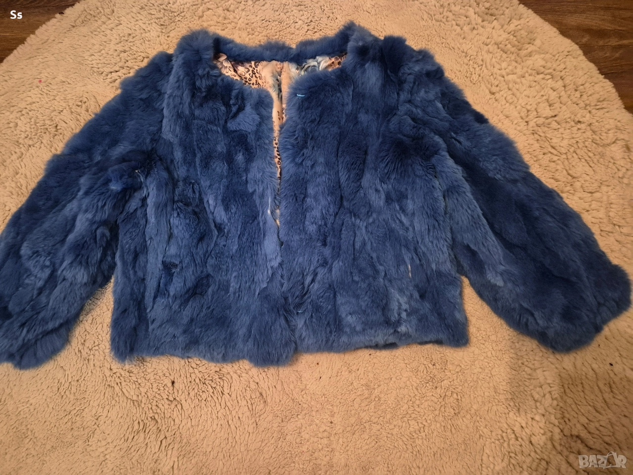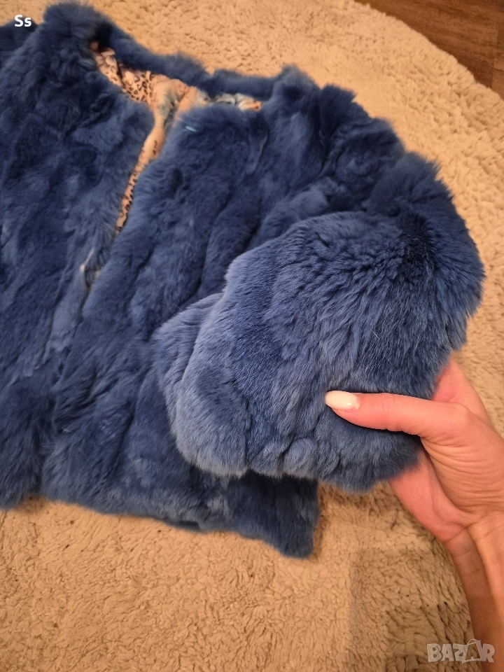 Палтото е в много красив син цвят. От изкуствен косъм с много високо качество. Отговаря на размер М. Няма забележки