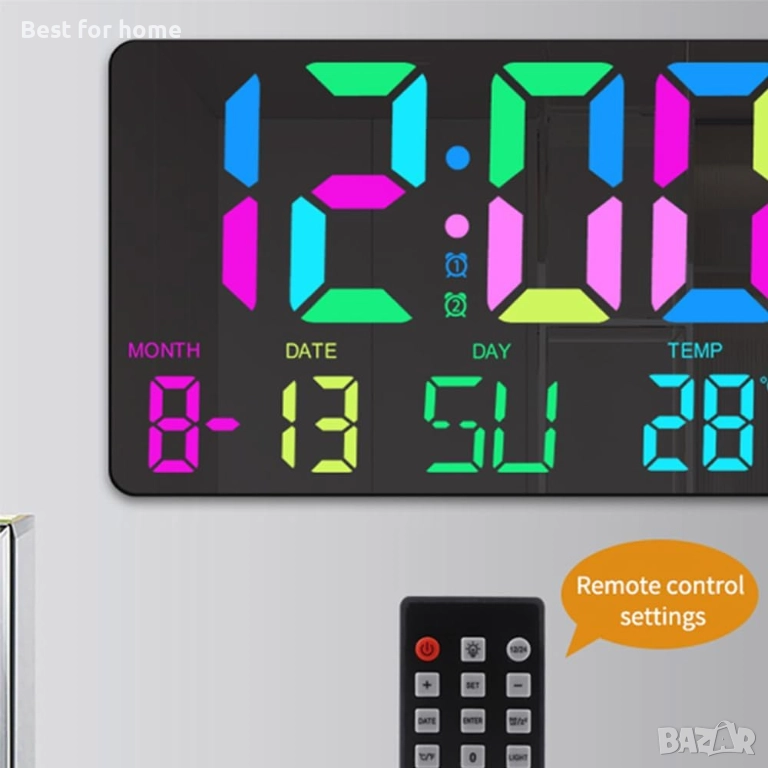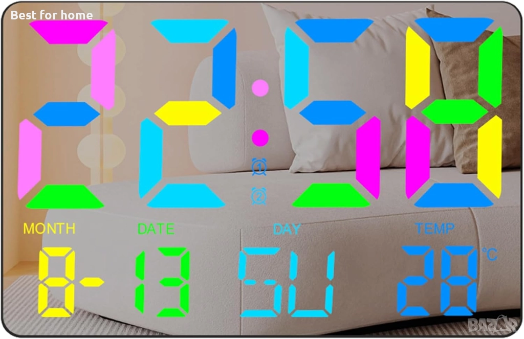Огромен дисплей: Изключително лесен за четене от голямо разстояние. Показва едновременно час, дата, ден от седмицата и температура.