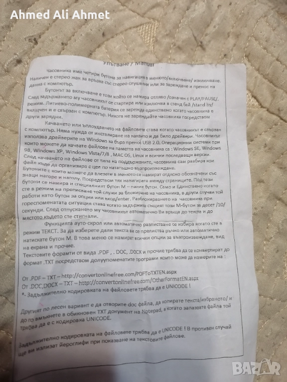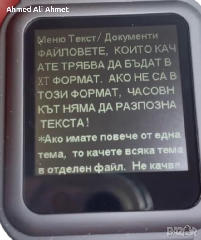 Продавам или давам под наем!Електронен часовник за преписване с памет 4 гб. Използван няколко пъти.Работи прфектно.Батерията му издържа до седмица!С кабел за зареждане.Перфектен за преписване.Има и инструкции за ползване! По време на изпита не се вижда текста от квесторите а само от преписващия!Лично аз с него си взех държавният изпит в университета!