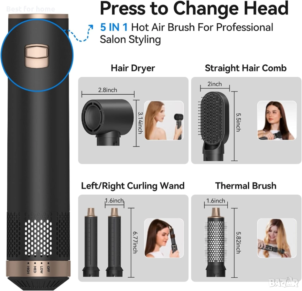 5 приставки в 1 комплект: Включва сешоар за бързо сушене, две автоматични маши за къдрене (лява и дясна), кръгла четка за обем и изправяща четка.