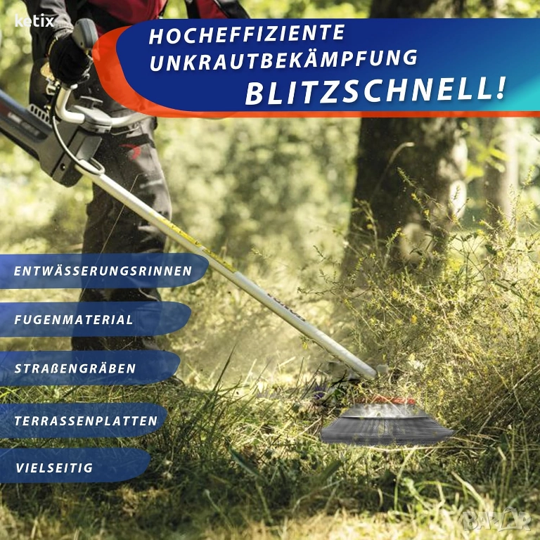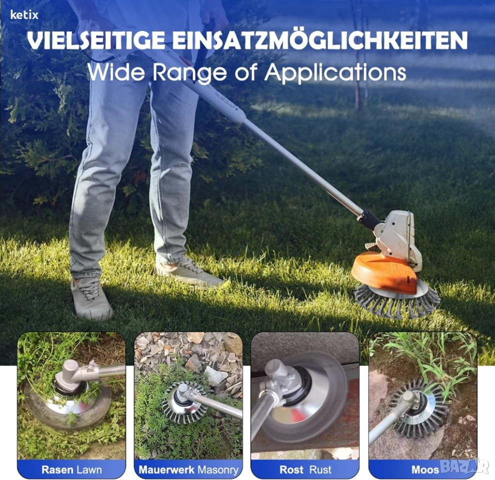 Универсална: идеална като четка за плевели за храсторези и безжичен тример за трева на терасата, алеята, тротоара и в градината.
