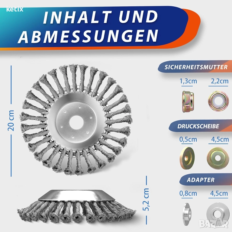 Универсална съвместимост: тази кръгла четка за тримери пасва на най-често срещаните централни отвори от 25,4 мм и 20 мм благодарение на включения адаптер. Включва пълен комплект монтажни елементи за незабавна употреба.