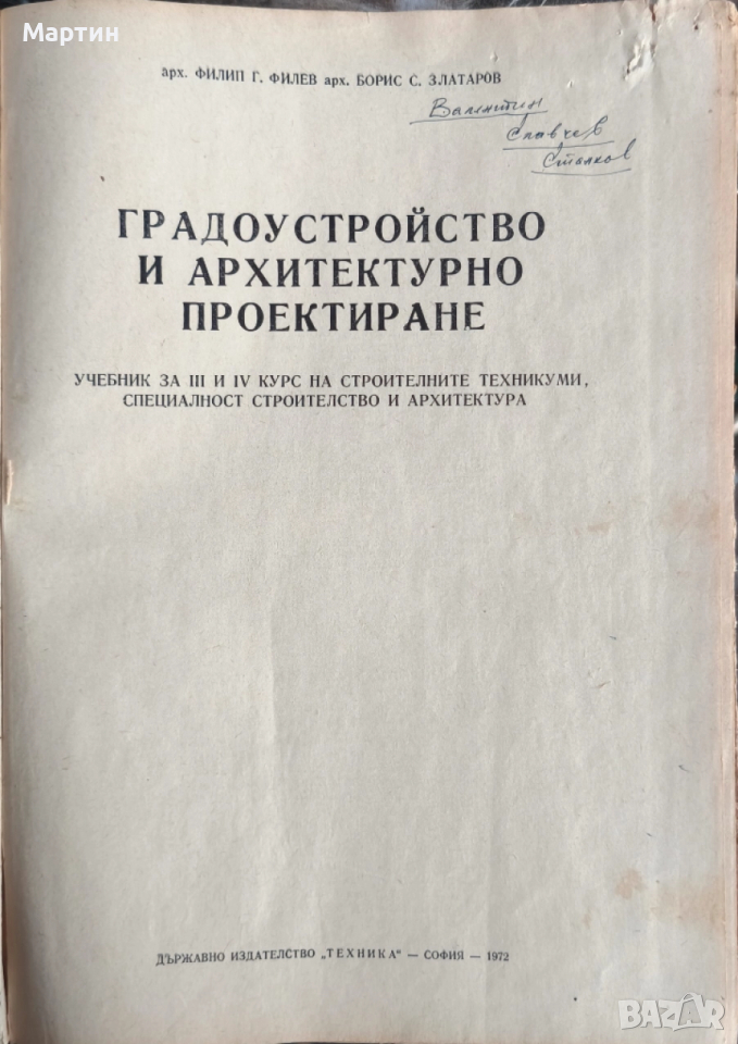 Градоустройство и архитектурно проектиране. Учебник за III и IV курс на строителните техникуми, специалност строителство и архитектура. Филип Филев, Борис Златаров., 1972 г.
