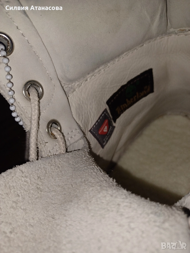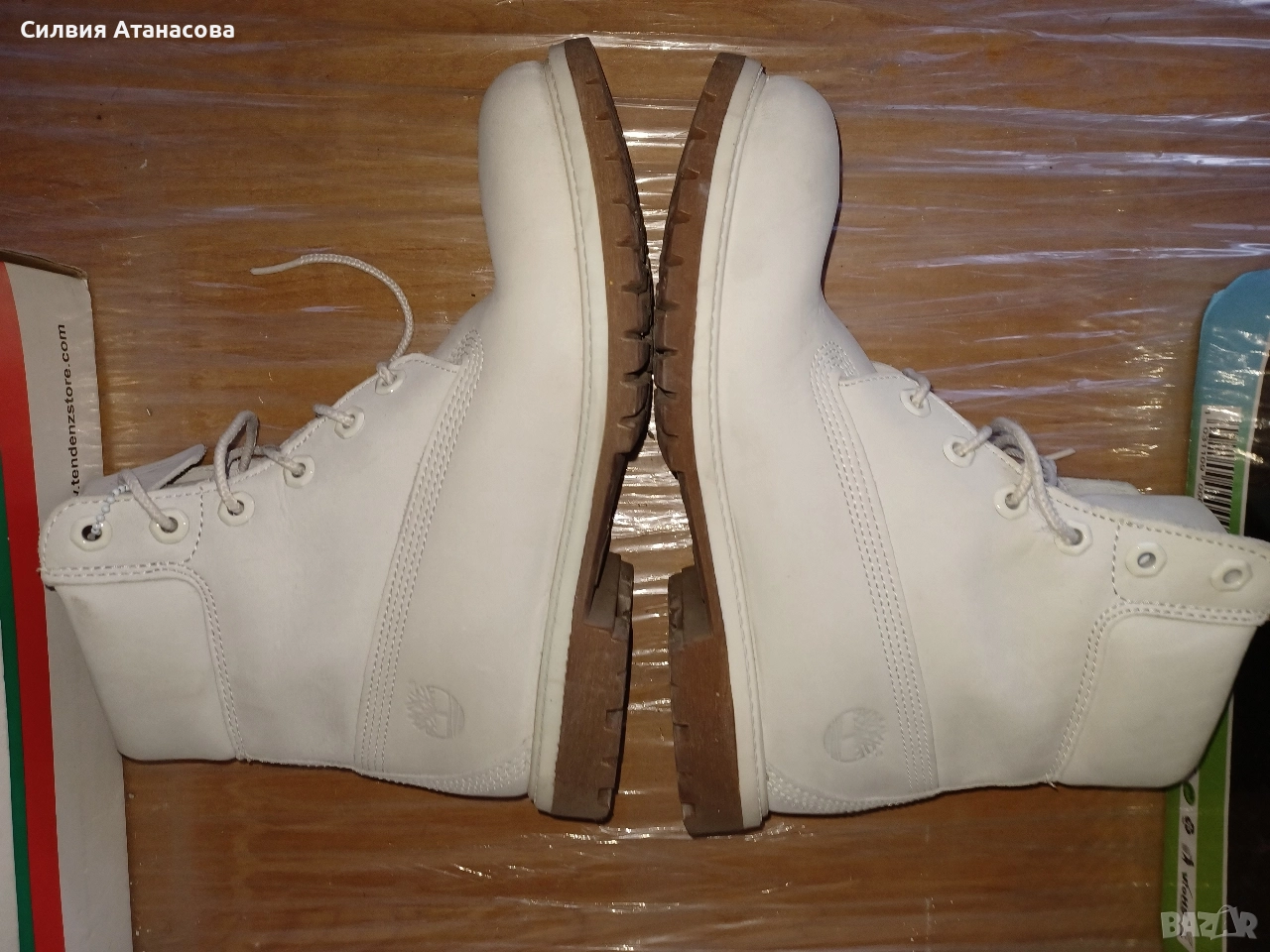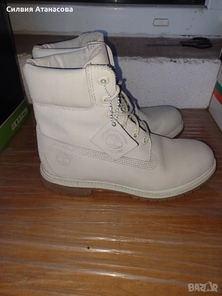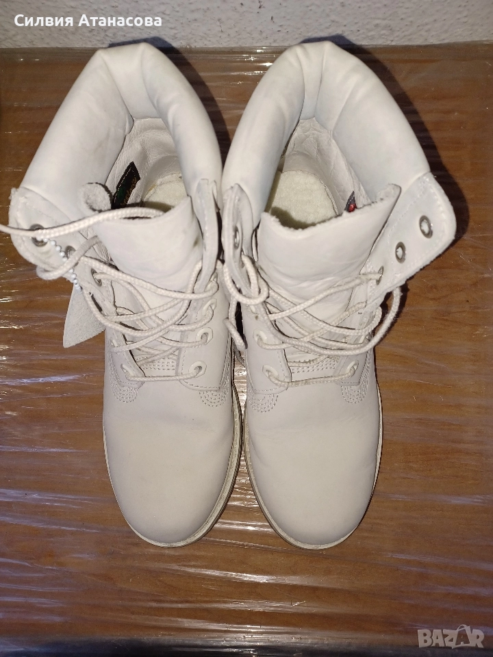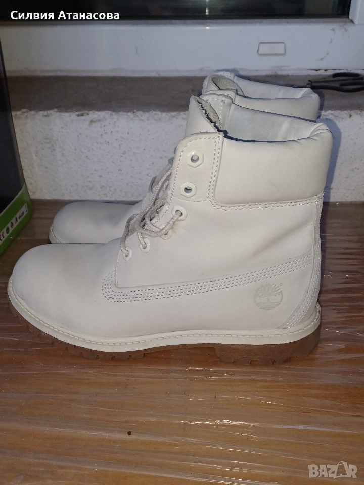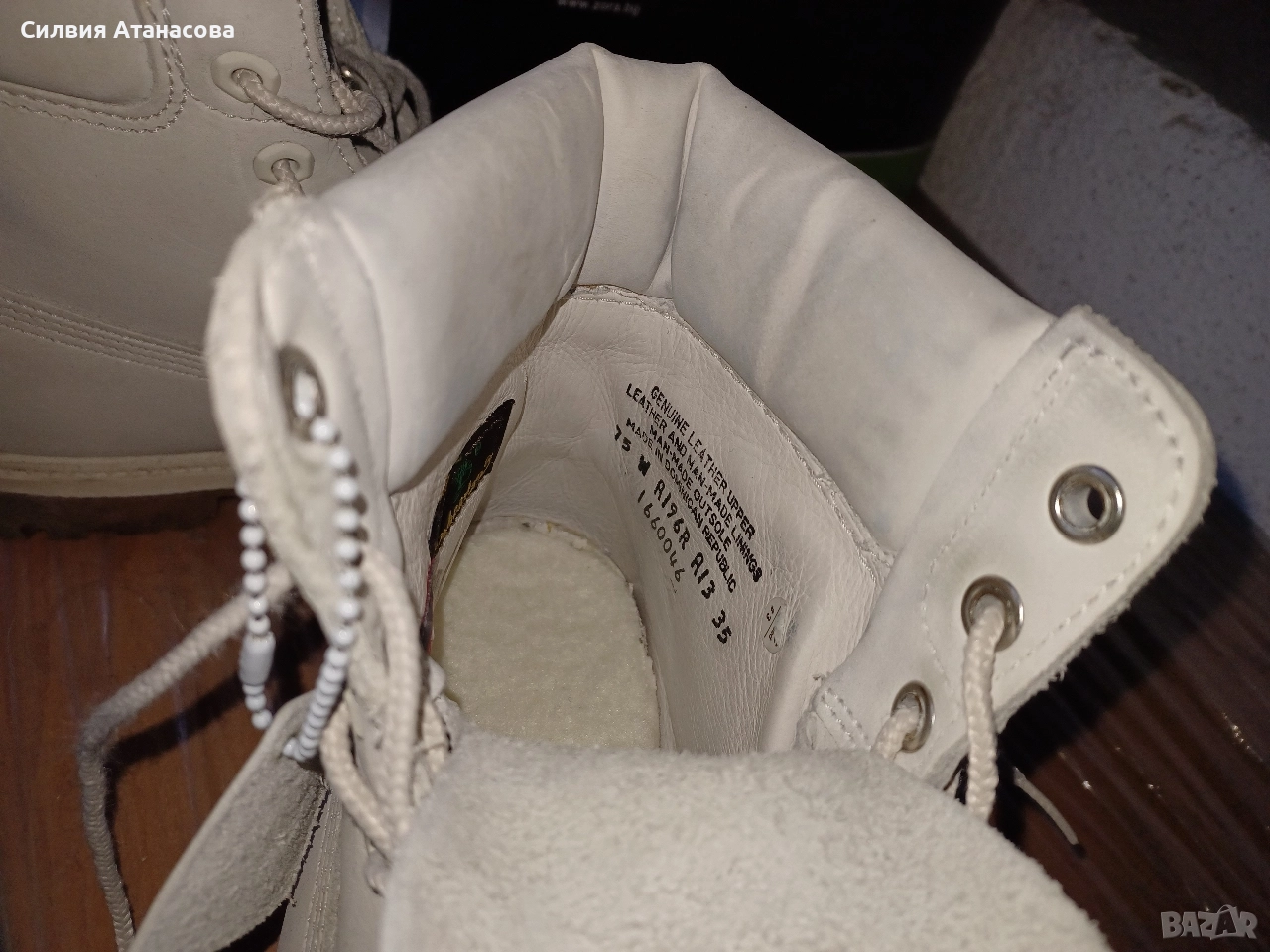Боти бели, естествена кожа Timberland, напълно здрави, само отвътре леко боядисано в синьо от дънки, което не се вижда като се обуят, отвън нямат никакви забележки.