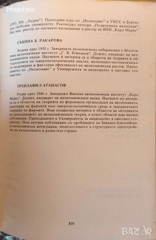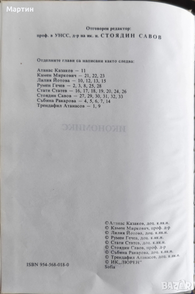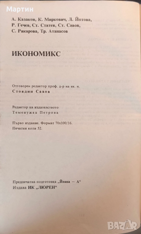 Икономикс., Стоядин Савов, Камен Миркович, Атанас Казаков, Лилия Йотова, Румен Гечев, Стати Статев., Издател И. К. Люрен., 1993 г., 831 страници. Учбникът е със зацапана корица от прашни пръсти, може да се почисти. Вътре цялостта на листитите и текстът е идеален.