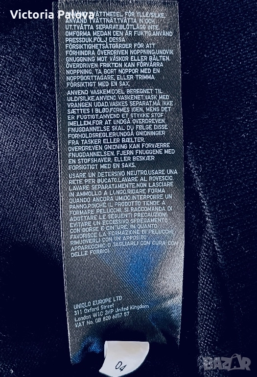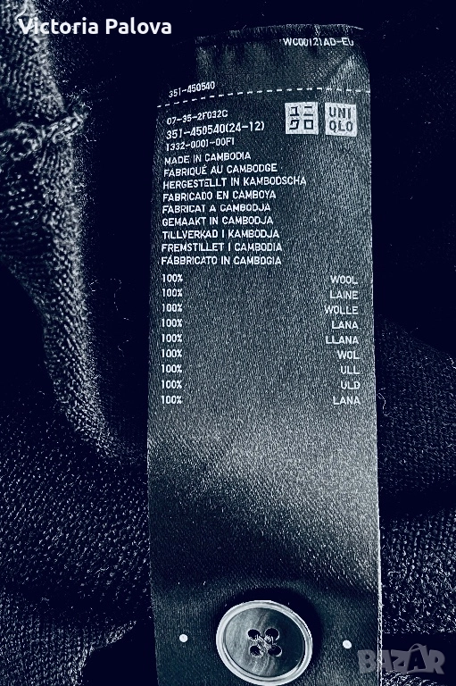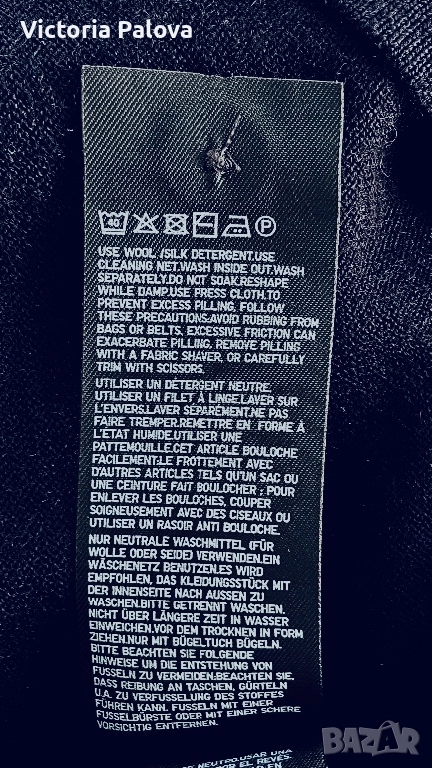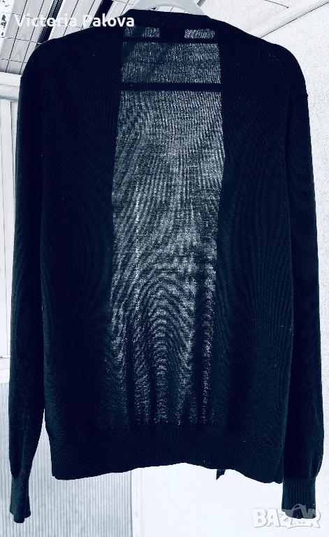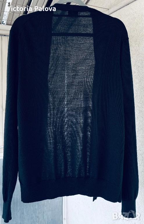 Extra Fine Merino V - Neck, размер S, рамо - 52см, ГО - 55см едностранно, дължина - 74-5см, ръкав - 69см. Изработен от 100% фина мериносова вълна ( 19,5 микрона), мек и гладък на допир, с гланцов блясък и машинно пране без деформация. Цвят тъмносин до черно , класическо V-образно деколте, копчета отпред, дълги ръкави с рипсени маншети, произведен в Камбоджа, идеален за есен/зима, за офис или casual визия. Може да се носи директно върху гола кожа, без да дразни.