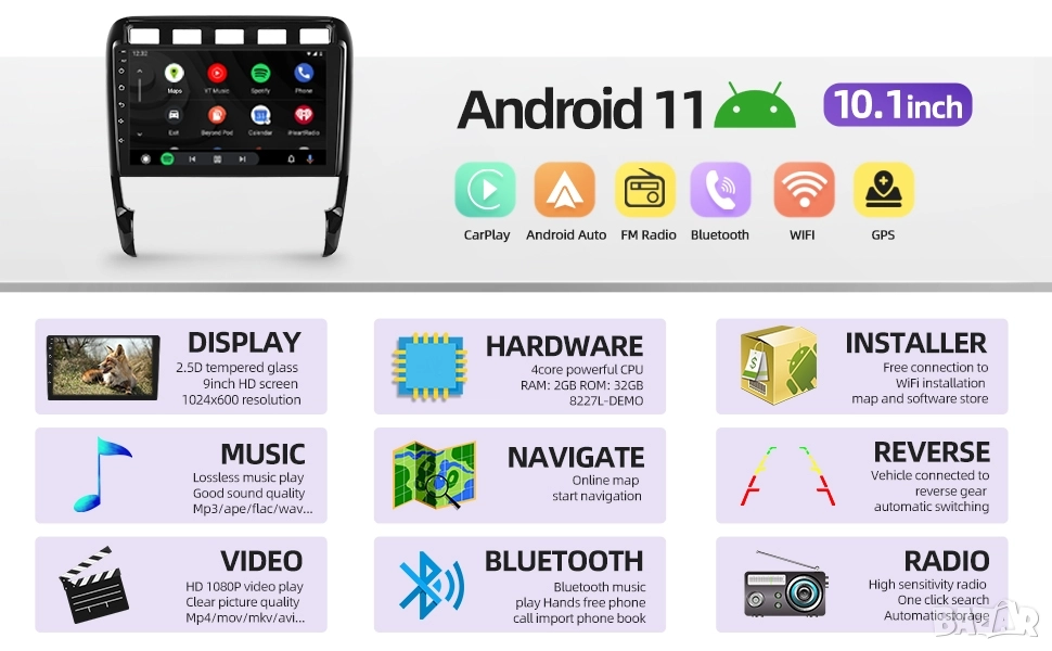 * Аудио и Радио: FM/RDS радио с 18 предварително настроени станции. Вграден EQ (еквалайзер) за прецизна настройка на звука и поддръжка на Hi-Fi качество.
