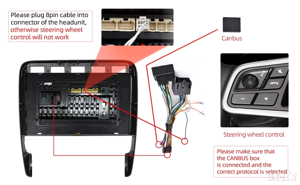 * Plug & Play инсталация: Системата е проектирана за директен монтаж без необходимост от рязане на кабели. В комплекта са включени всички необходими преходници и Canbus модул, който запазва функциите на оригиналното управление от волана.