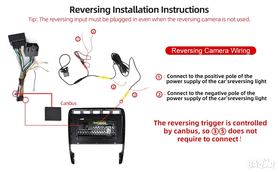 * Сигурност при паркиране: Включена в комплекта AHD камера за задно виждане. Системата автоматично превключва към изображението от камерата при включване на задна предавка.