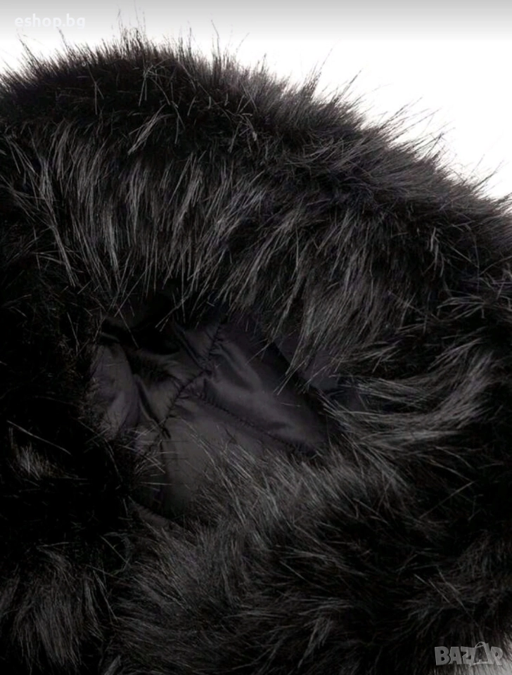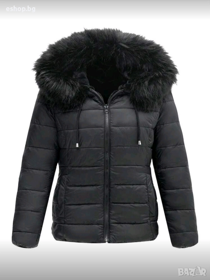 Двулицево дамско яке с качулка в черен цвят. Ново. Едната страна е от шушляк, другата страна е от изкуствен пух. Размери: -рамо - 42 см; -бюст - 112 см; -дължина - 64 см; -дължина ръкав - 63 см.
