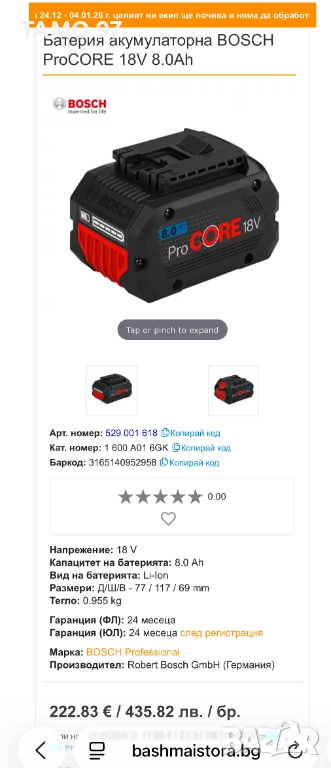 Продавам мощни акумулаторни батерии на Бош 18V 8.0Ah с индикатор от PROCore серията. Имам налични 3 броя като нови и използвани броени пъти, oригинално унгарско производство от 11.2024г. внос от Франция. Може пакетна цена за 3-те батерии 310евро иначе за една батерия цената е крайна! Пращаме с опция преглед и тест с куриерска фирма еконт, може и лично предаване за гр. Шумен.