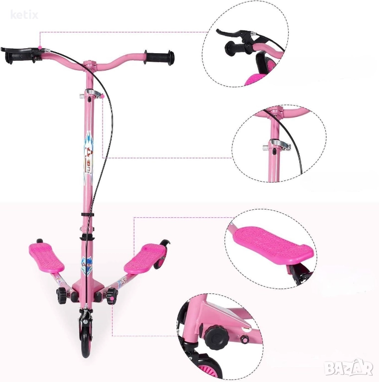 РЕГУЛИРУЕМА ВИСОЧИНА Изработена от здрава стомана и алуминий, регулируемата система за кормило може лесно да регулира височината между 86 см (фиксирана) и 96 см (най-висока). Уникалният дизайн с три колела осигурява по-добра стабилност. Лесно завиване, дрифт и ускорение.