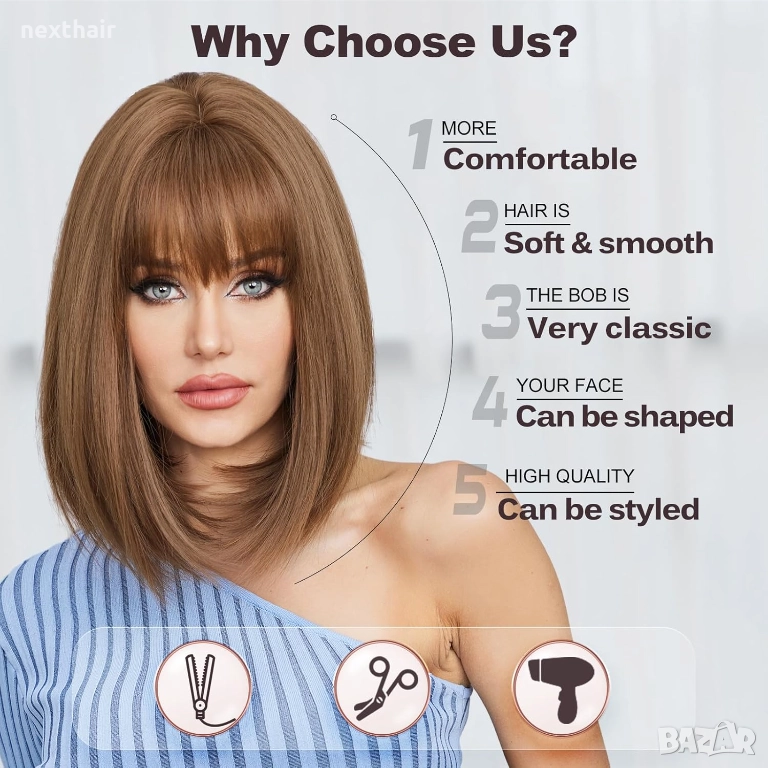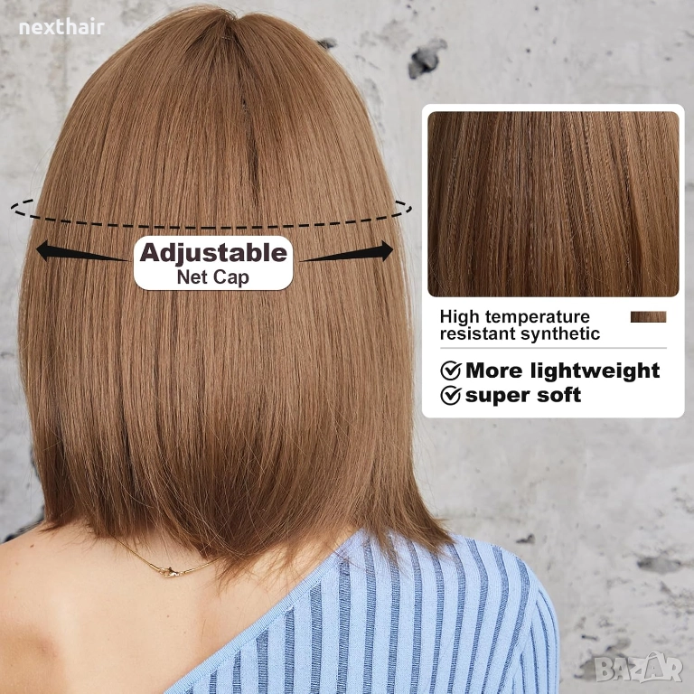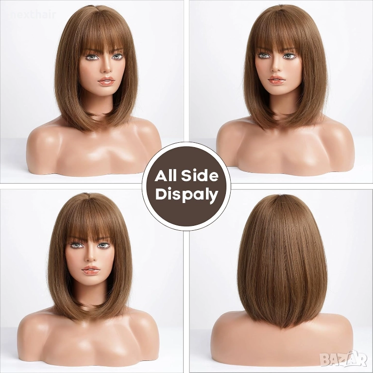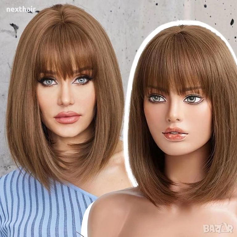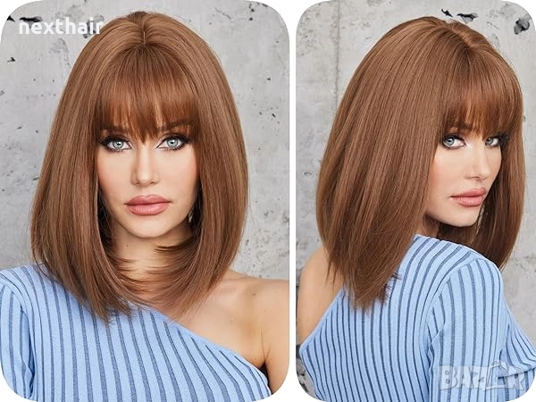 Кафява права синтетична перука с бретон - 35 см, естествен вид и лека структура