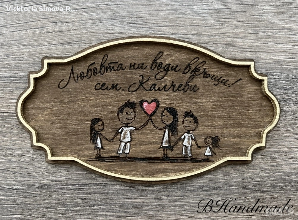 Красиви, ръчно изработени, персонализирани табели за врата. Изработени от висококачествен дървен материал, те ще добавят уютен и личен акцент към всяка врата (входна или интериорна). Идеални за украса на дома или като подарък. Цените могат да варират от 27лв. до 67лв. за брой в зависимост от вида на табелата и сложността на проекта.