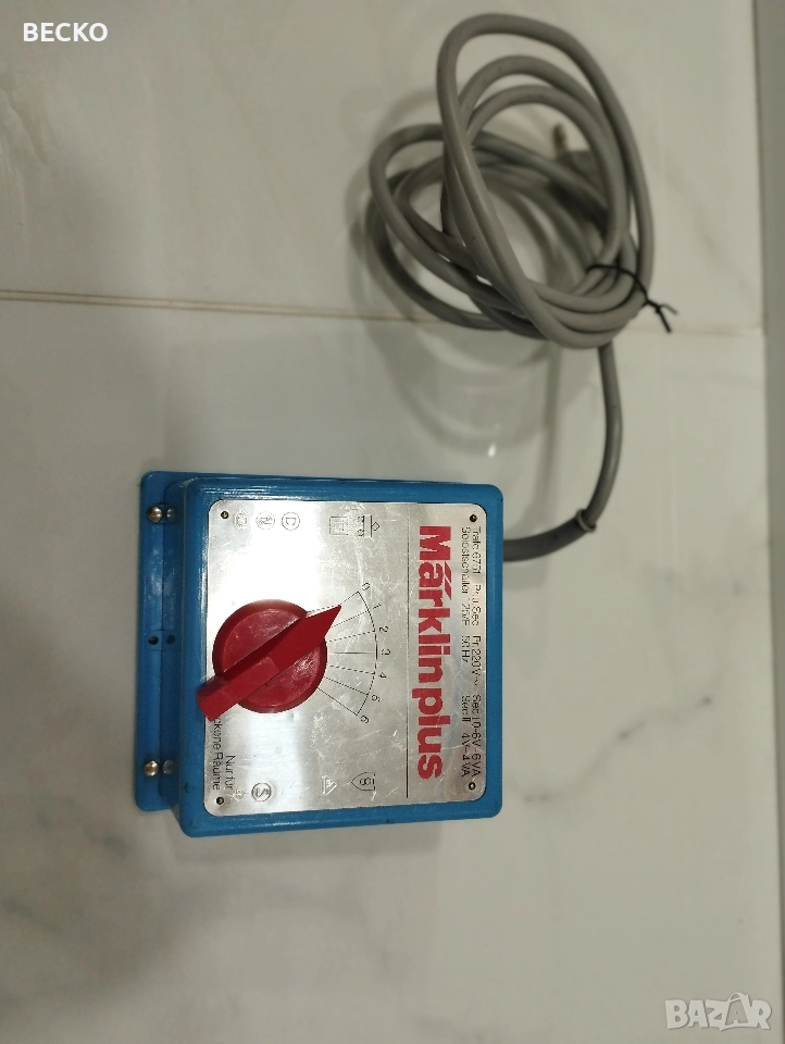 трансформатор/регулатор Märklin, предназначен основно за аналогови модели влакове Märklin (H0 и подобни). Производител: Märklin (Германия) Модел: Trafo 6751 Тип: Регулируем понижаващ трансформатор с вграден регулатор Предназначение: Захранване и управление на аналогови моделни влакове и аксесоари Маркировка: Nur für trockene Räume – „Само за сухи помещения“ Електрически характеристики (по табелката) Първична страна (вход): Pr.U. / Sec: Входно напрежение: 220 V~ Честота: 50 Hz Захранване от стандартната мрежа (стар европейски стандарт 220 V) Вторична страна (изходи): Sec I: 0–6 V ~ / 6 VA – Обикновено за аксесоари (осветление, стрелки, релета и др.) Sec II: 4–14 V ~ / 4 VA – За задвижване и управление на локомотиви Изходното напрежение е променливо (AC), характерно за класическите аналогови Märklin системи. Управление Червен въртящ се регулатор (копче) Има градуирана скала от 0 до 6 Използва се за: регулиране на скоростта на влака промяна на напрежението към релсите Завъртането увеличава/намалява напрежението Корпус и конструкция Корпус: Син, от удароустойчива пластмаса Преден панел: Метална табелка с: логото Märklin plus (червено) електрически символи сертификационни знаци Странична част: Изводи/клеми за свързване към релси и аксесоари Захранващ кабел: Фиксиран, за 220 V мрежа Символи и означения Символи за двойна изолация Знак за безопасност и сертификация Символи за влак и трансформатор, указващи предназначението Немски надписи – типично за оригиналните Märklin устройства Практическо предназначение Управление на: скоростта на локомотив посоката (чрез реверсивен импулс при Märklin AC системи) Захранване на: релси стрелки осветление други аксесоари за макети