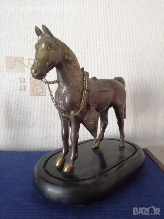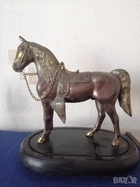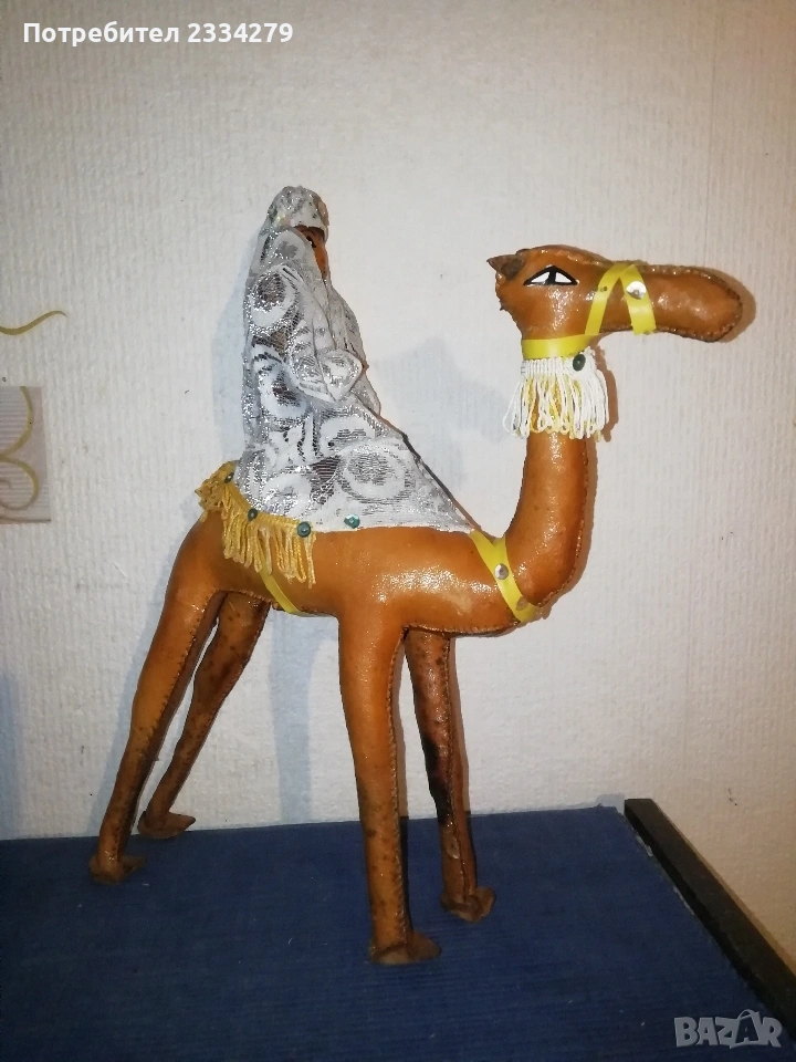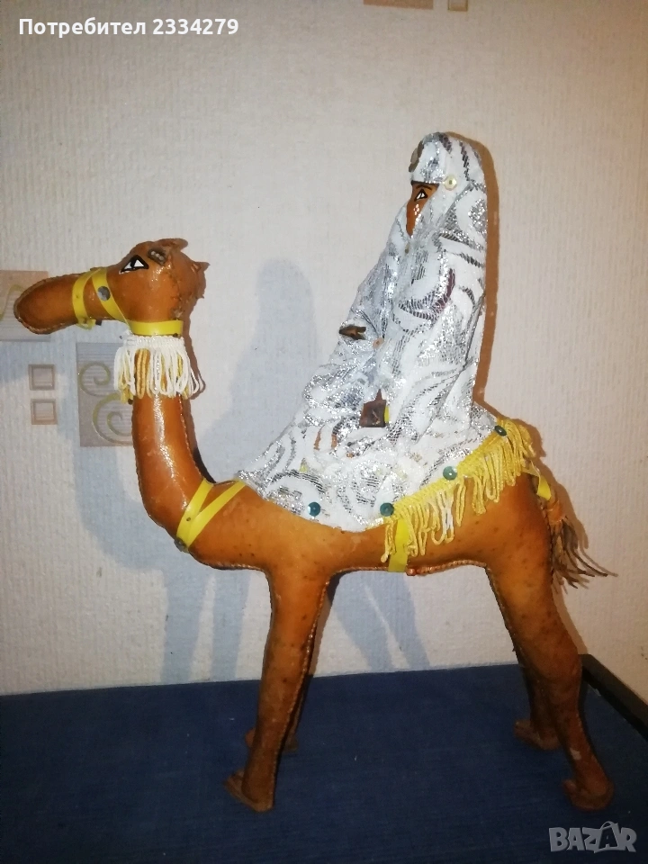 Стари сувенири статуетки от различни ; N:2 ръчна авторска отливка на оседлан кон поставен на дървена стойка, размери 30х25см., цена 50€.; N:3 ръчно изработена шита и рисувана ,,арабска жена яздеща камила" всичко от естествена кожа и тялото, лице, ръце на жената, изработка от 60-70те години, размери 33х25см., цена 15€.