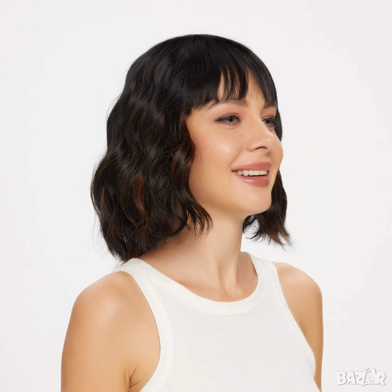 Къса синтетична перука тип боб (30 см), създадена за естествен и модерен вид. Наситеното черно се допълва от фини златисти кичури, които придават дълбочина и блясък, а нежните къдри и мекият бретон оформят красиво лицето.