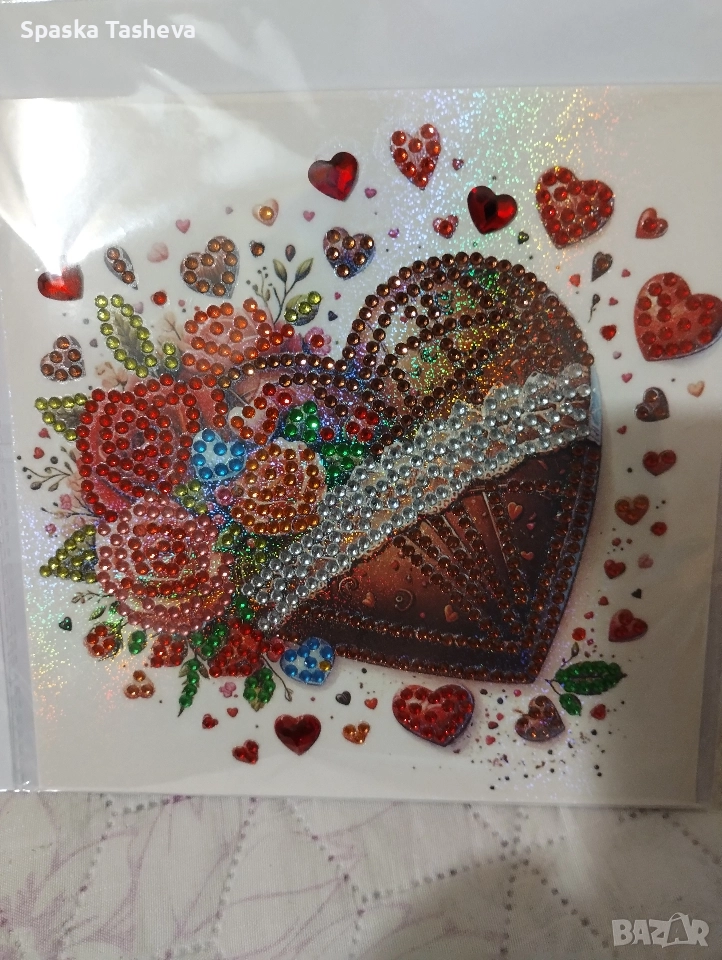 Диамантени картички за Свети Валентин ❤️. Размер 15 на 30 см. Изработени от дебел гланциран картон и украсени с различни по големина 5Д диамантени камъчета. Опаковани с пощенски плик.