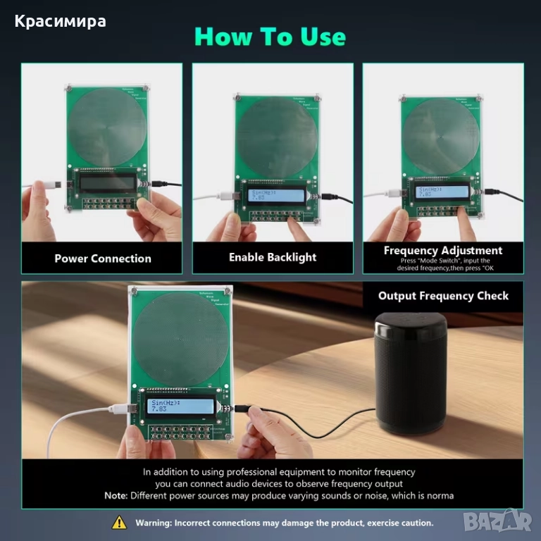 100000 Hz, ултра-нискочестотен пулсов аудио уред, захранван с USB. /с