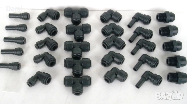 ФИТИНГИ - бързи връзки, Южна Корея, за тръби Ф 8, 5 и 3 мм. В съответствие със стандарта за хранителни течности (NSF-51). Продават се комплект 54 бр., както са показани на снимките за 87 € или на бройка - 2 € / брой.