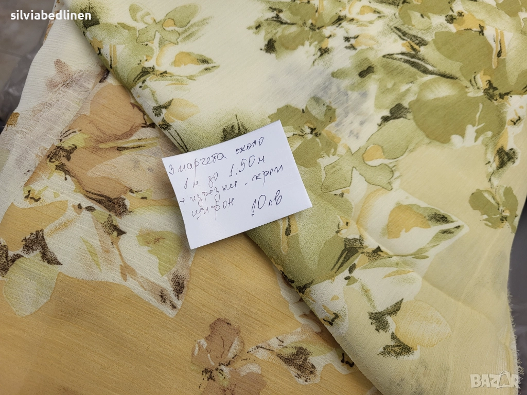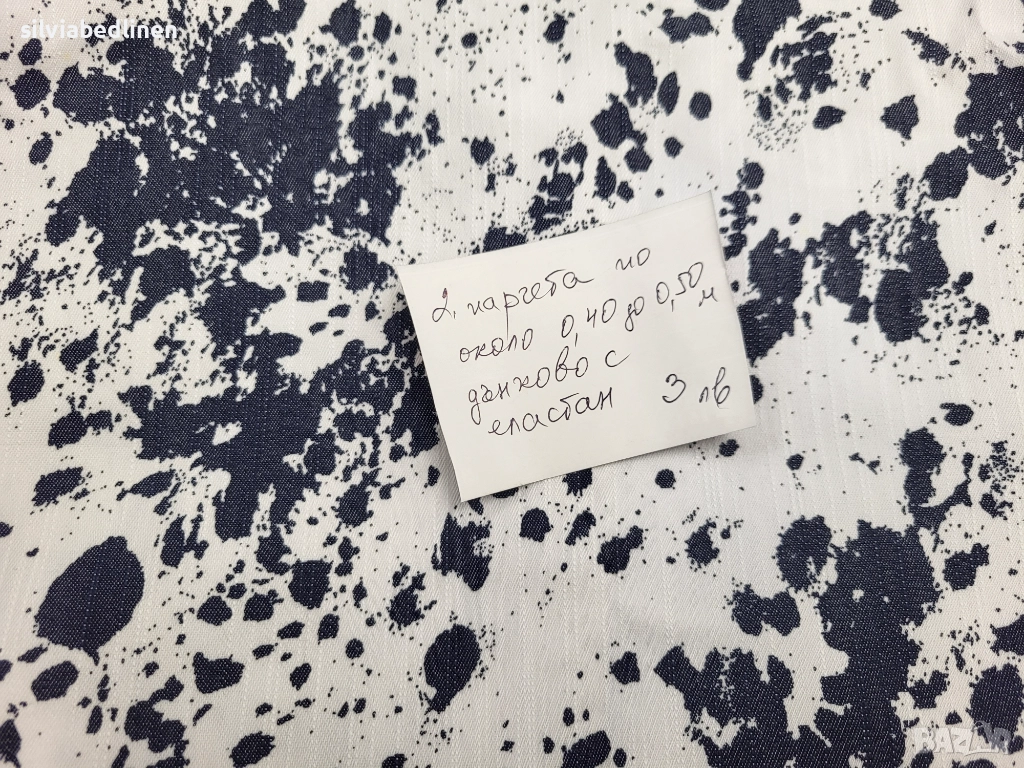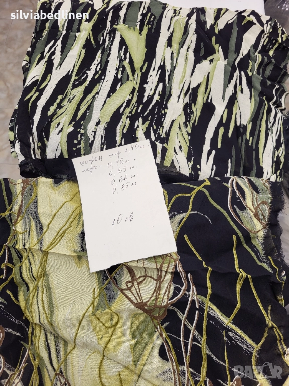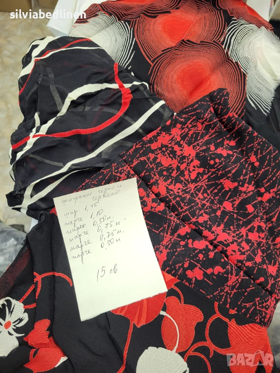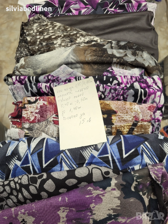Продавам парчета плат, останали от производство на дамска конфекция. Има парчета от шифон, трико, екокожа, платове за поли, сака и панталони. Подходящи са за изработване на дрехи, чанти, пачуърк изделия. На всяка снимка има размер на парчетата и цена в лева(снимките са правени през лятото на миналата година).